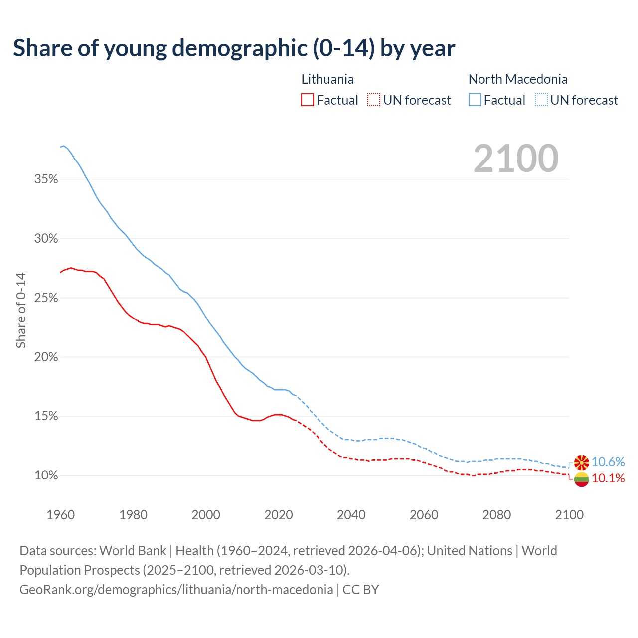- The share of young demographic (0-15 years old) in Lithuania is 14.7% vs 16.8% in North Macedonia.