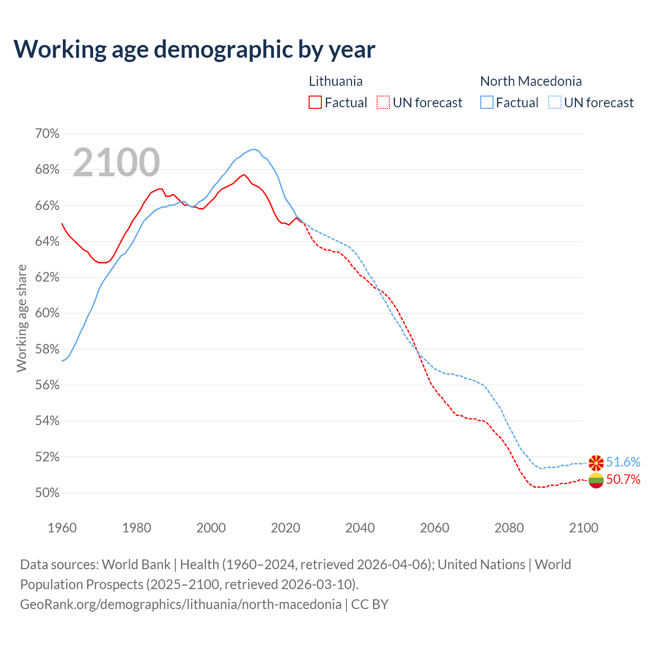 - Lithuania has 1.84M working age adults (aged 15-64) vs 1.18M in North Macedonia.