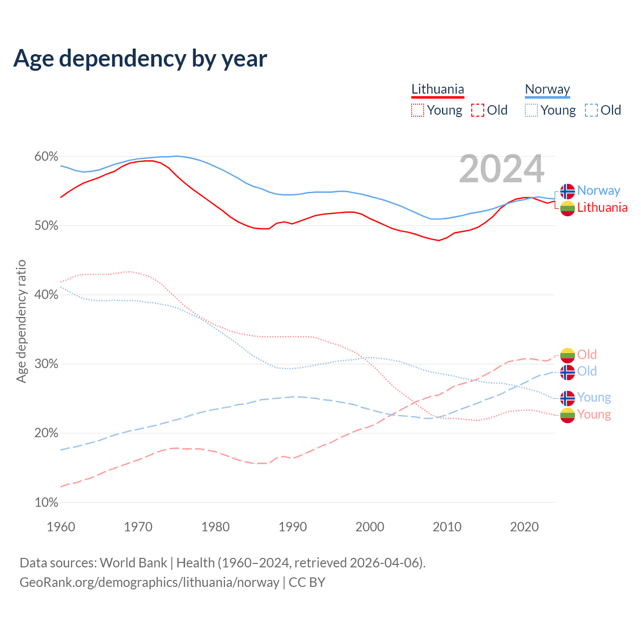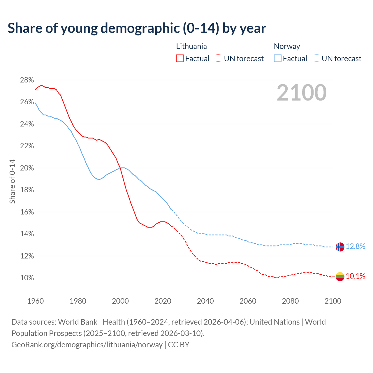- The share of young demographic (0-15 years old) in Lithuania is 14.7% vs 16.2% in Norway.
