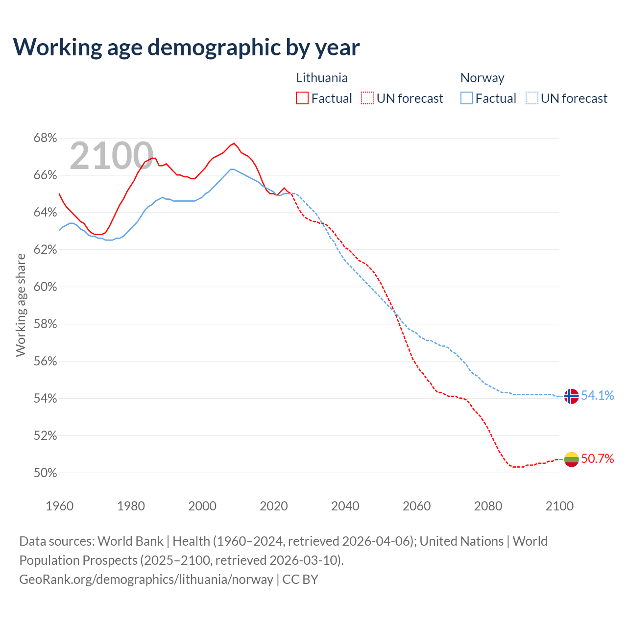 Median age Lithuania vs Norway, 1960-2100