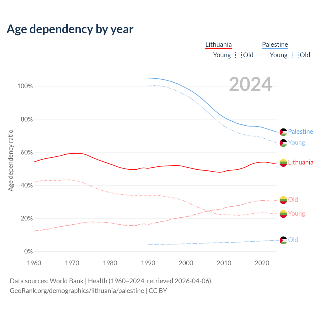 The share of older people aged 65 and over is 20.2% in Lithuania and 3.84% in Palestine. Life expectancy in Lithuania compared to Palestine .