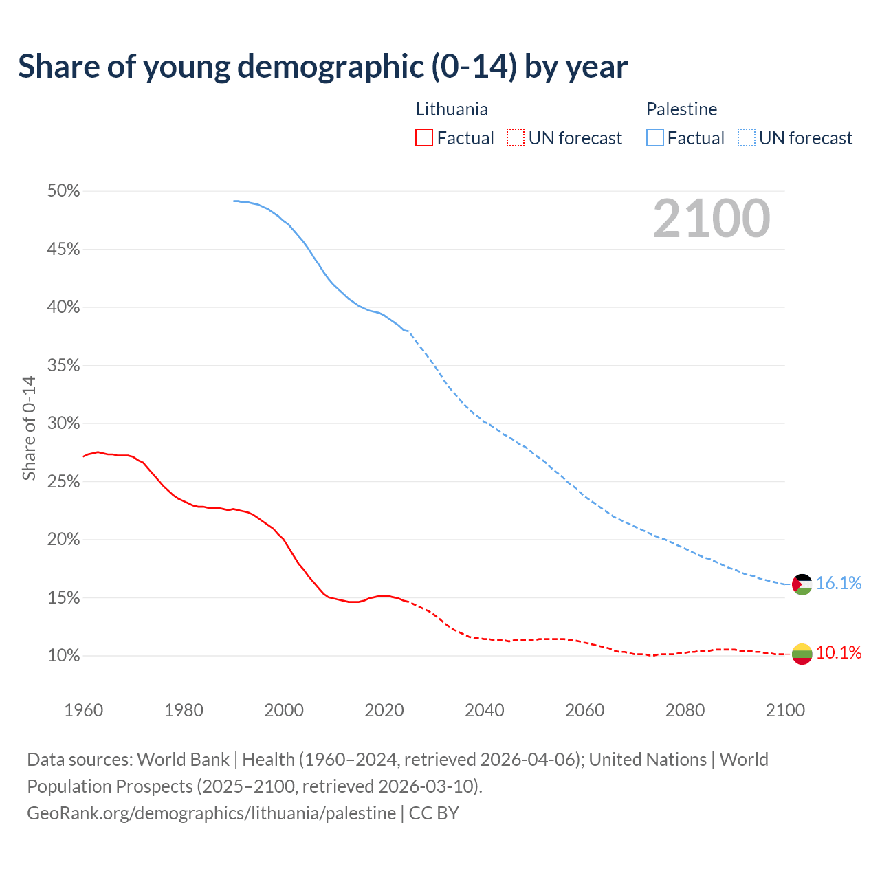 - The share of young demographic (0-15 years old) in Lithuania is 14.7% vs 38% in Palestine.