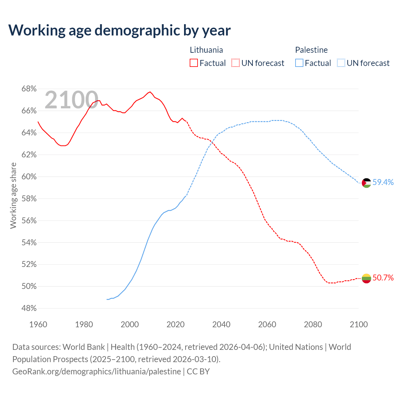 - Lithuania has 1.84M working age adults (aged 15-64) vs 3.2M in Palestine.