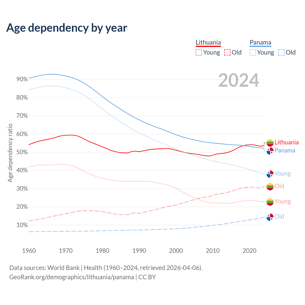 - The share of young demographic (0-15 years old) in Lithuania is 14.7% vs 24.9% in Panama.