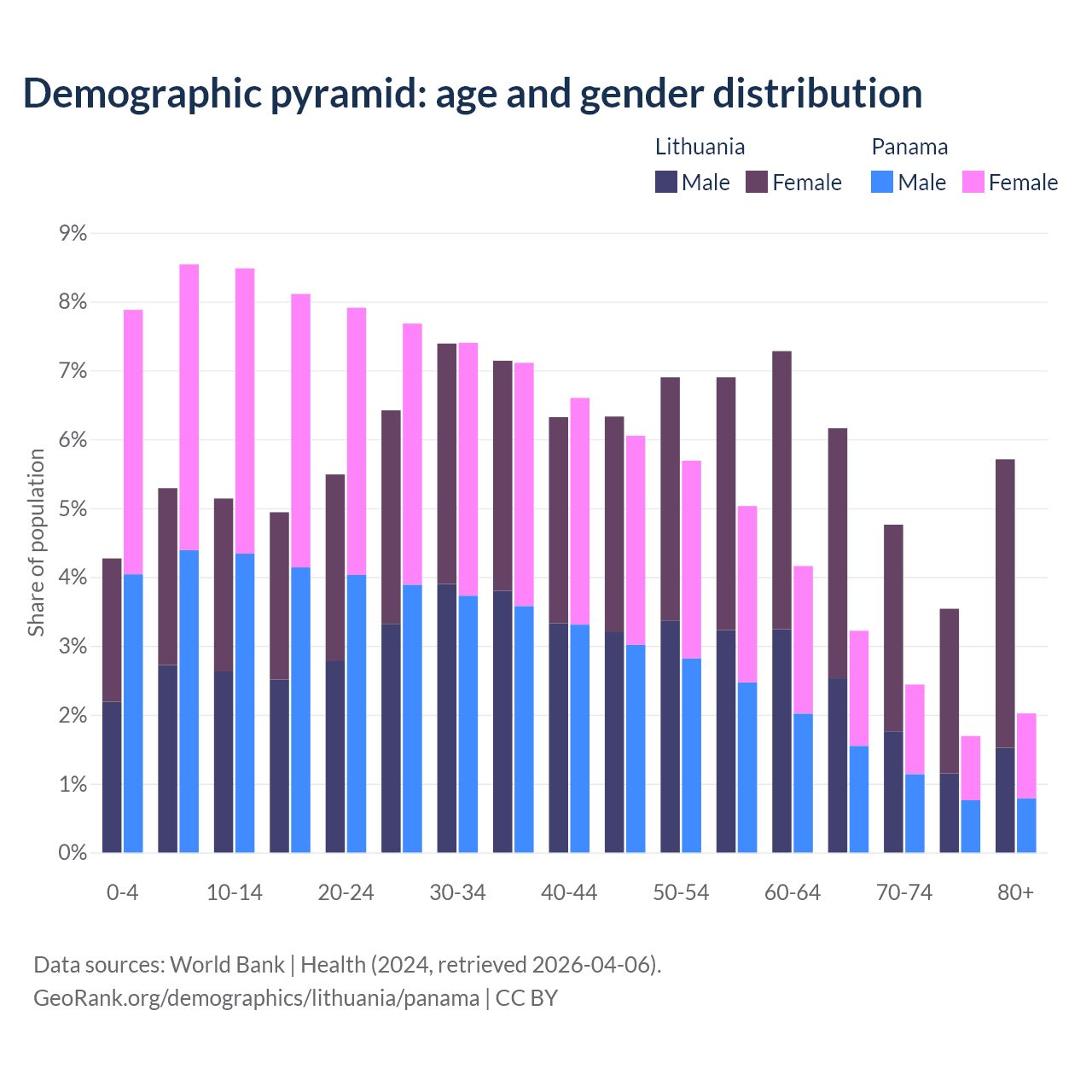 - Lithuania is ranked 28/196 by median age (oldest to youngest) vs 94/196 for Panama.