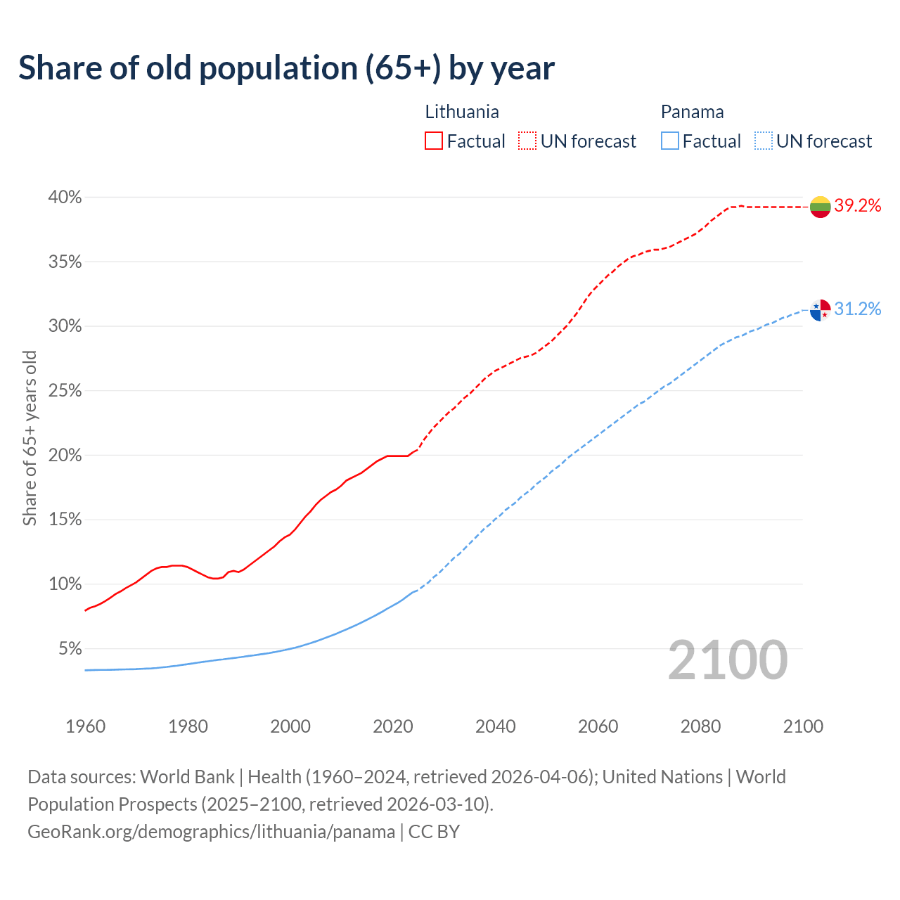 - The share of old-age demographic (65+) in Lithuania is 20.2% vs 9.35% in Panama.