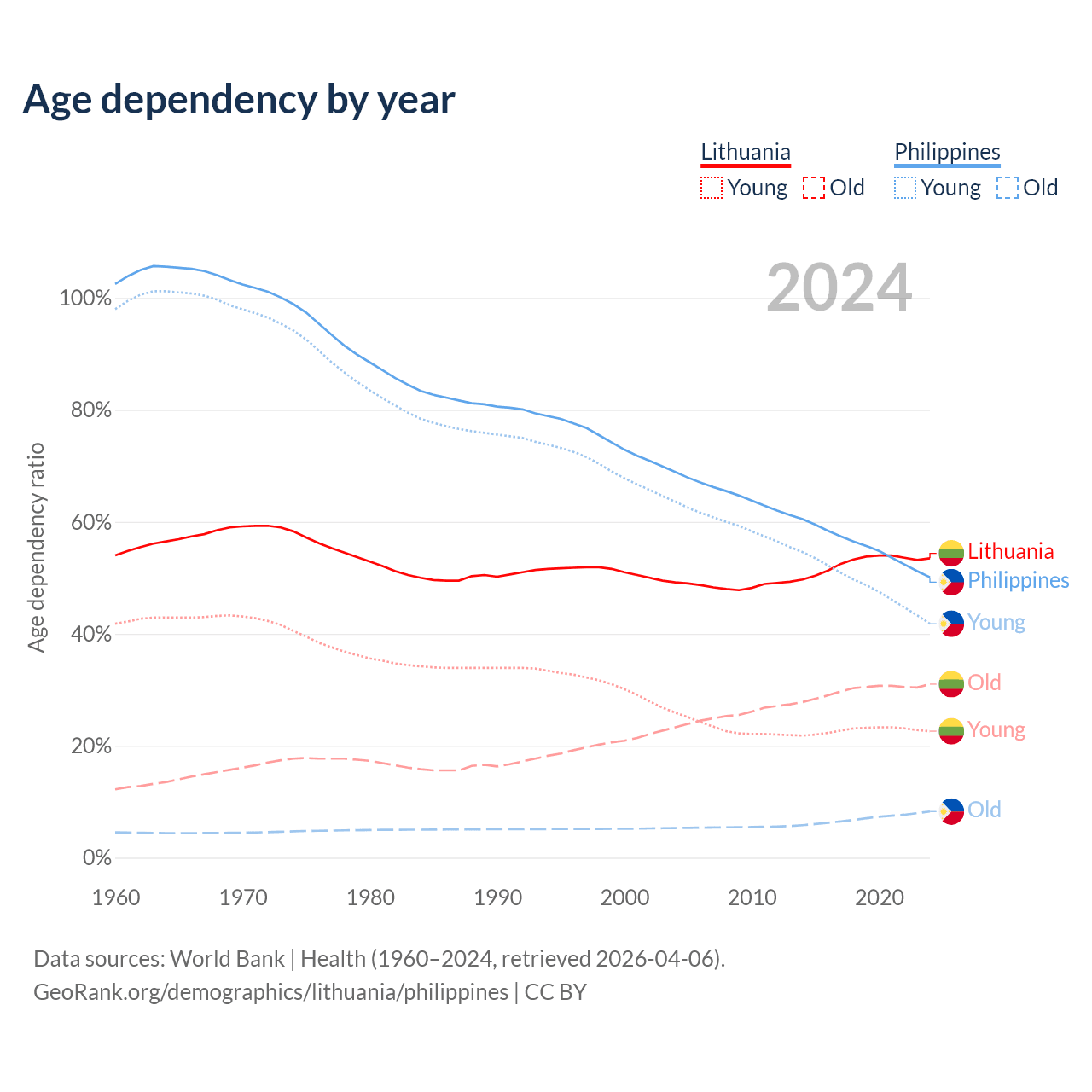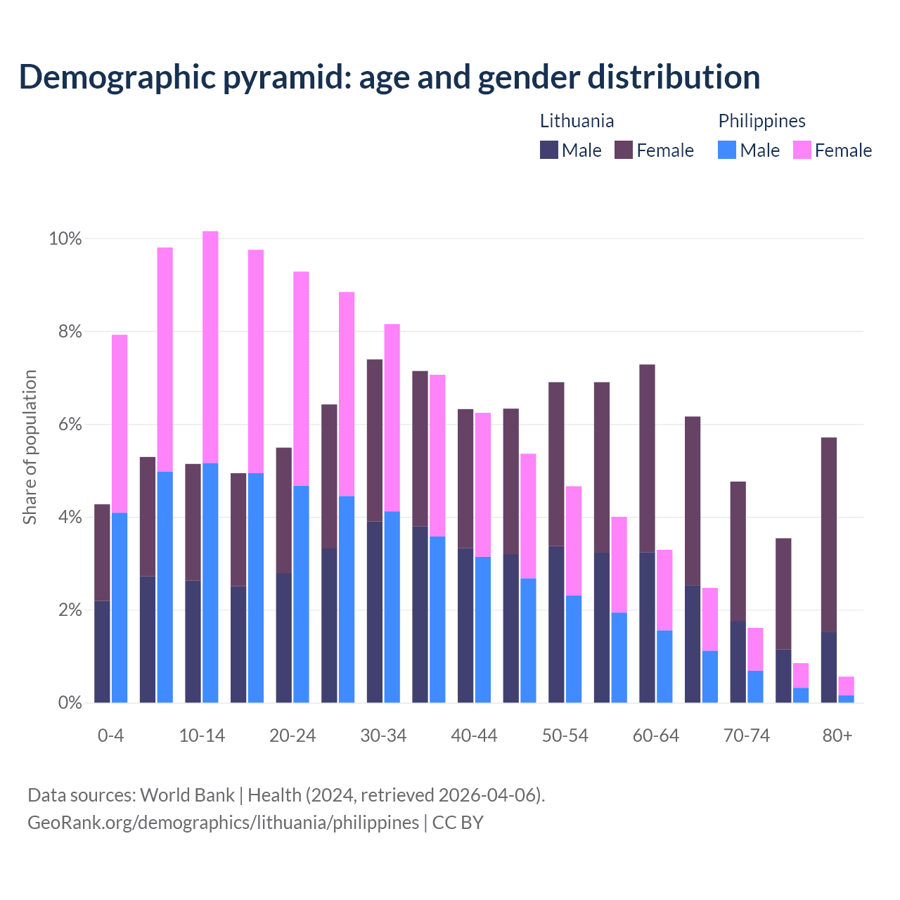The share of older people aged 65 and over is 20.2% in Lithuania and 5.49% in the Philippines. Life expectancy in Lithuania compared to the Philippines .