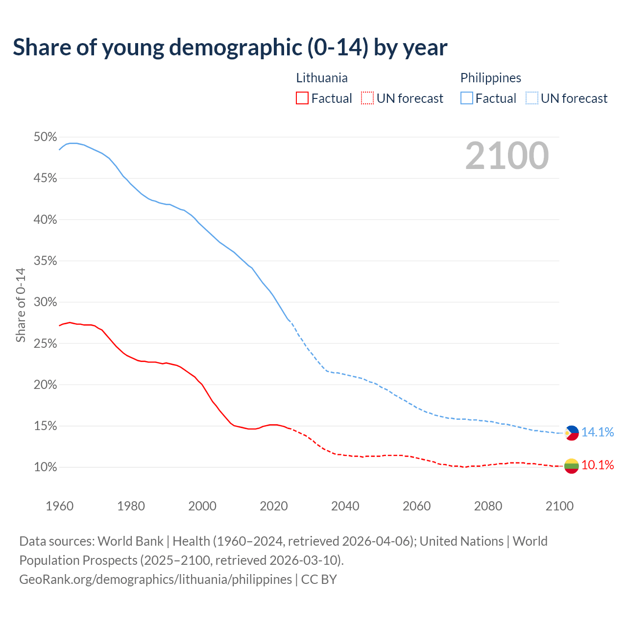 - The share of young demographic (0-15 years old) in Lithuania is 14.7% vs 27.9% in the Philippines.
