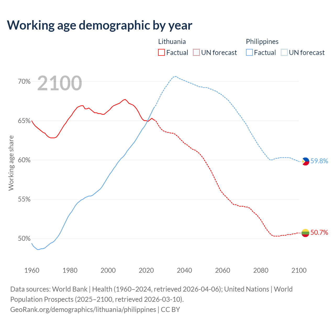 - Lithuania has 1.84M working age adults (aged 15-64) vs 78.6M in the Philippines.