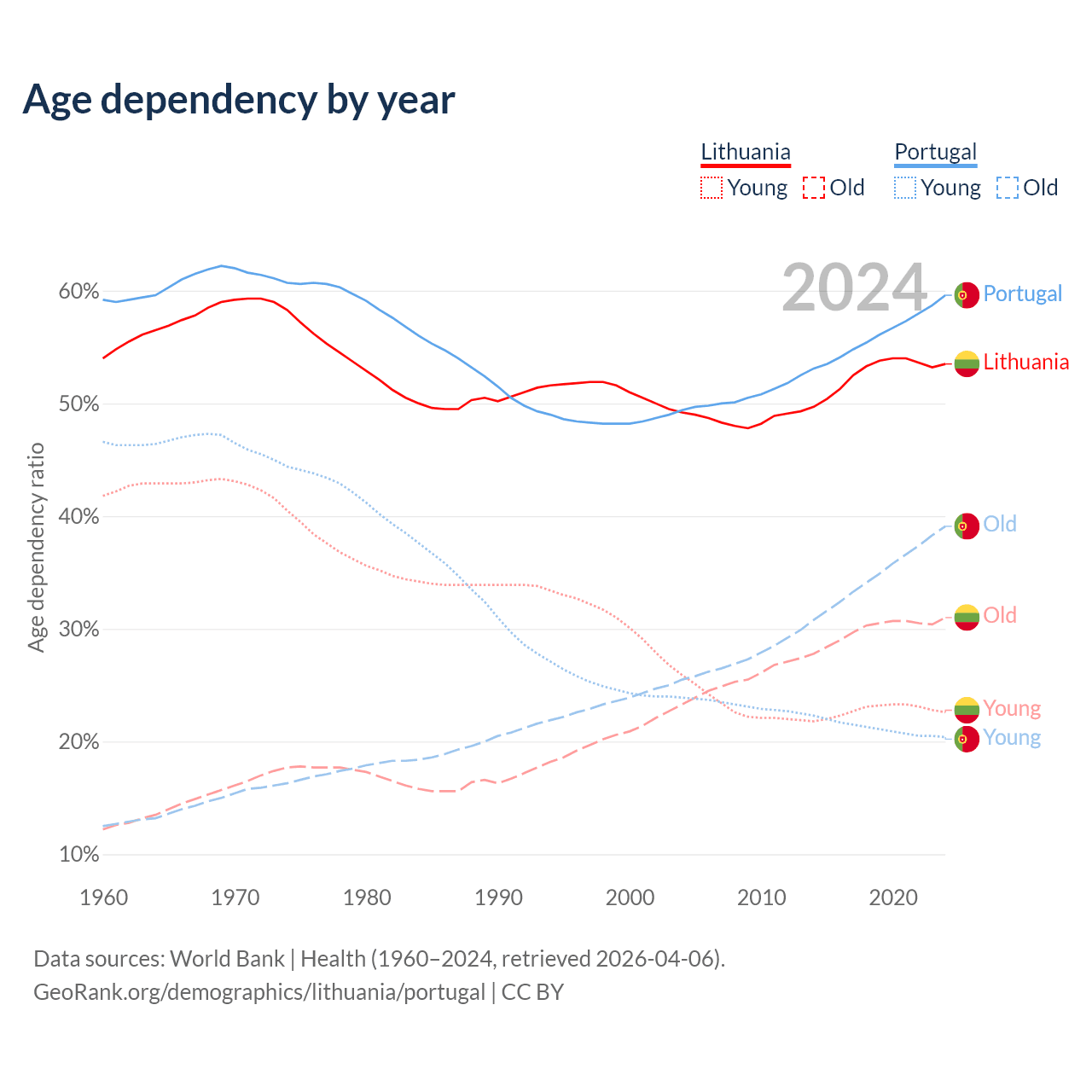 - Lithuania is ranked 28/196 by median age (oldest to youngest) vs 5/196 for Portugal.