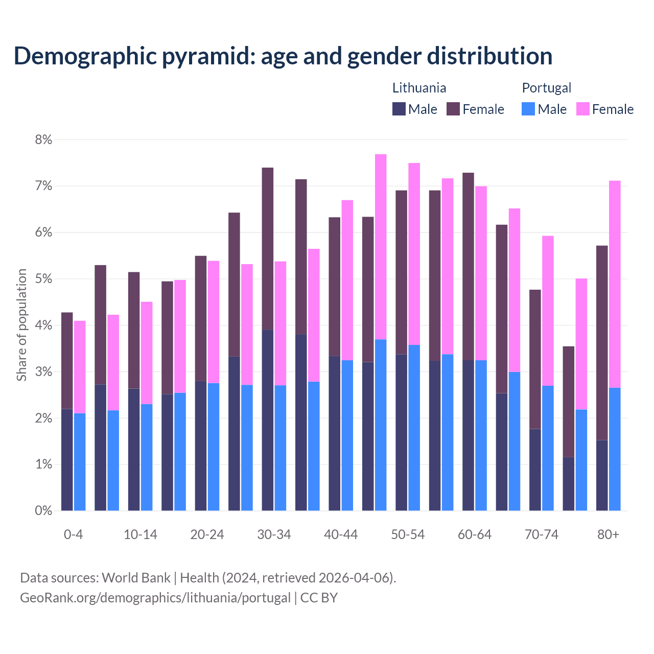 - As of 2026, the population of Lithuania is 2.83M vs 10.7M in Portugal - 3.77 times difference.