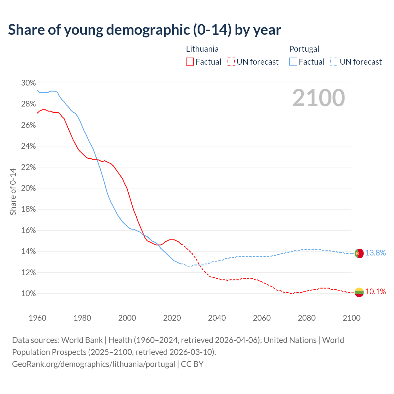 - The share of young demographic (0-15 years old) in Lithuania is 14.7% vs 12.8% in Portugal.