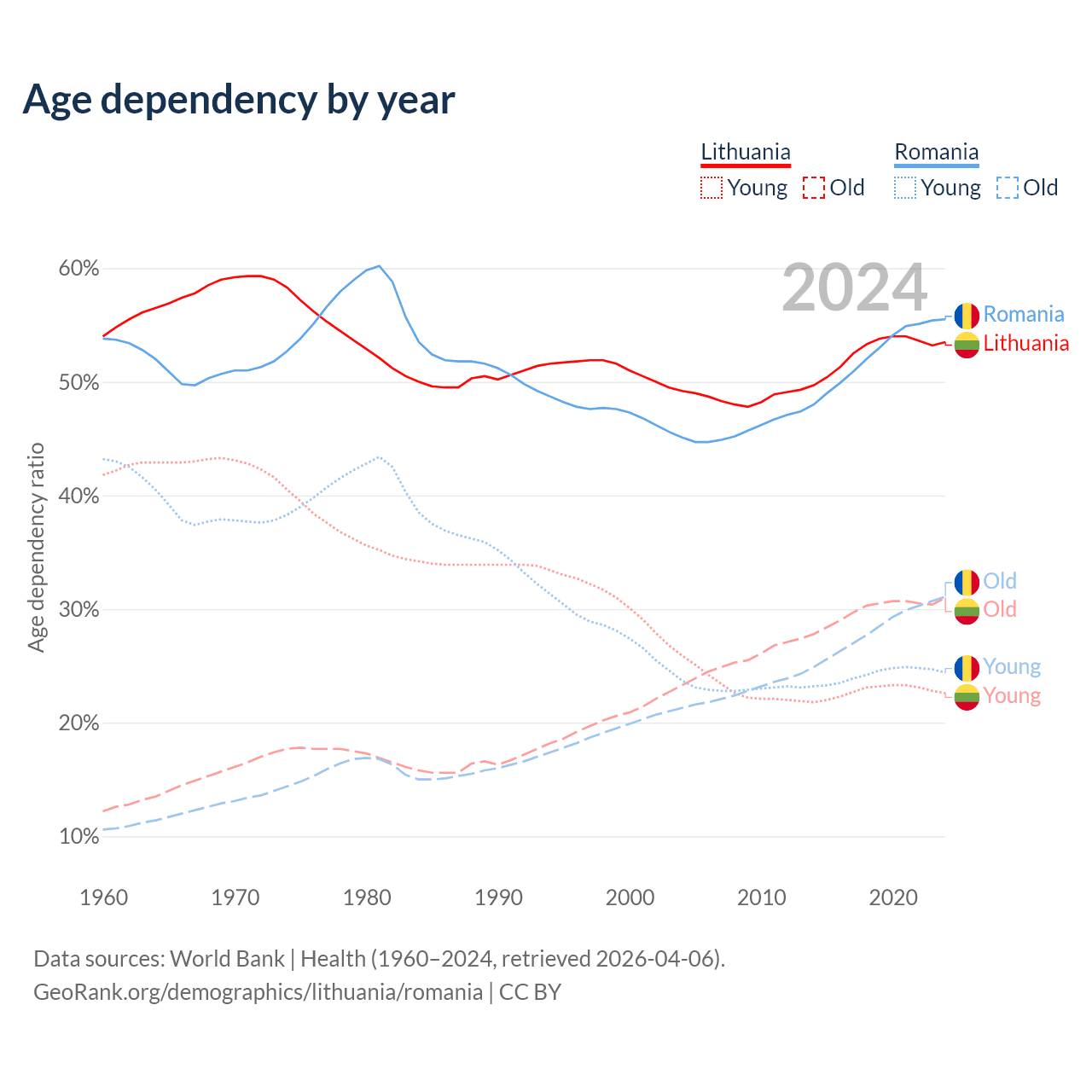 - Lithuania is ranked 28/196 by median age (oldest to youngest) vs 23/196 for Romania.