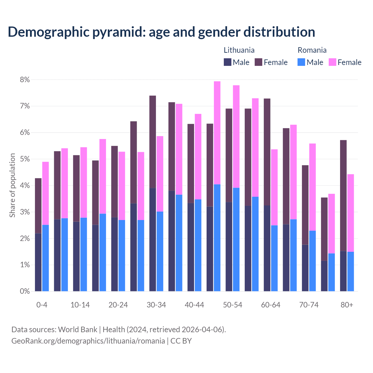 - As of 2026, the population of Lithuania is 2.83M vs 18.8M in Romania - 6.66 times difference.
