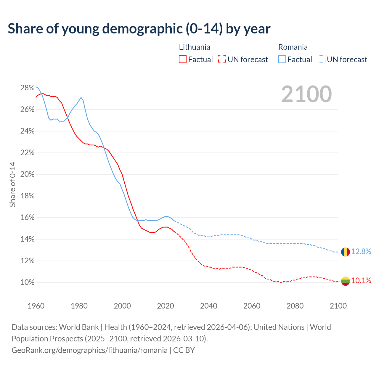 - The share of young demographic (0-15 years old) in Lithuania is 14.7% vs 15.7% in Romania.