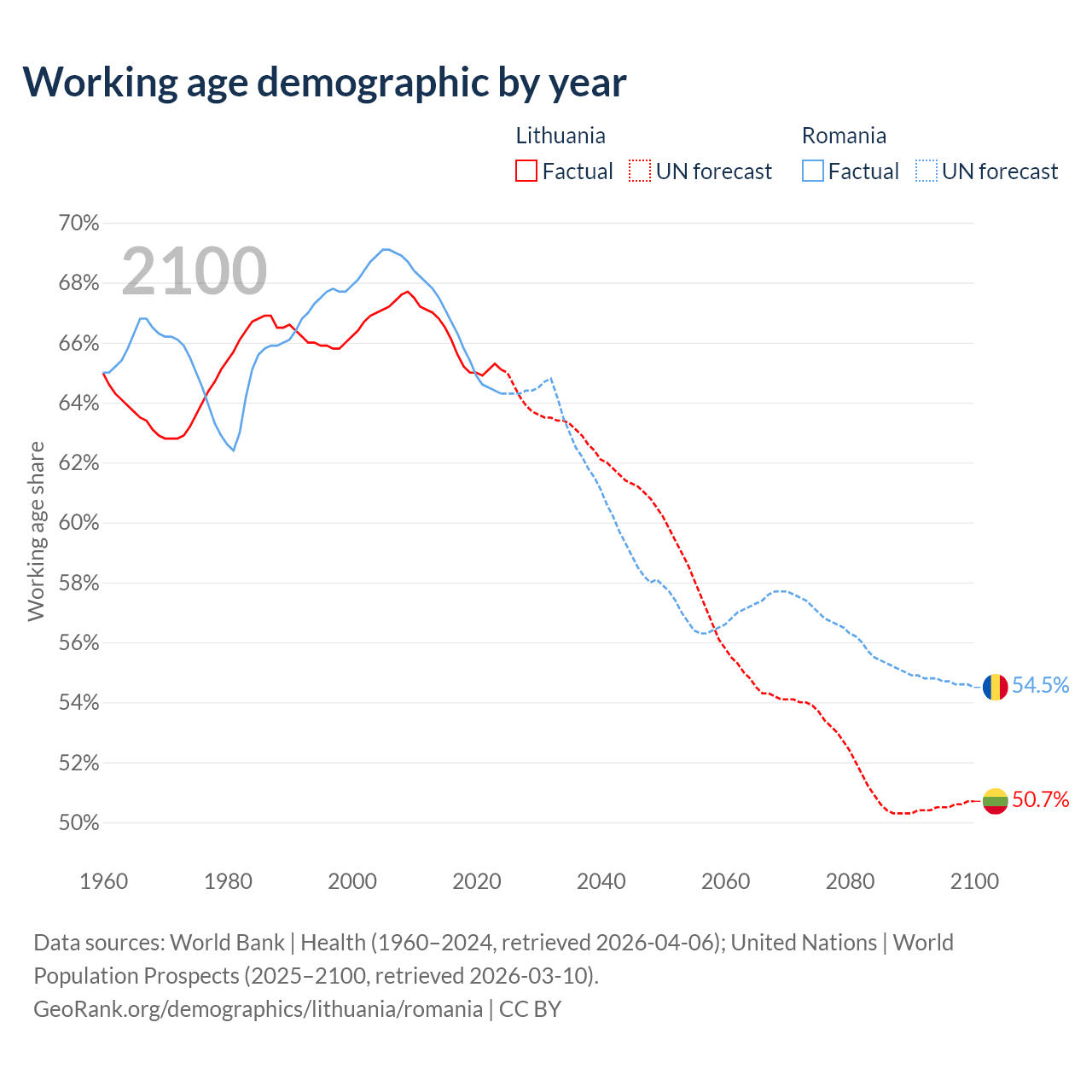 - Lithuania has 1.84M working age adults (aged 15-64) vs 12.1M in Romania.