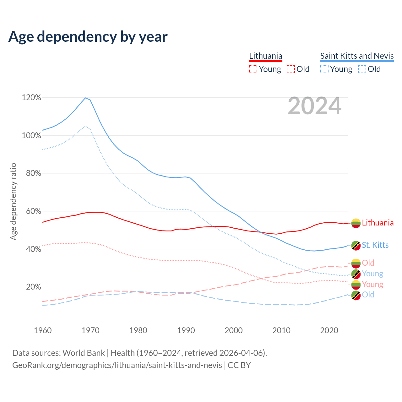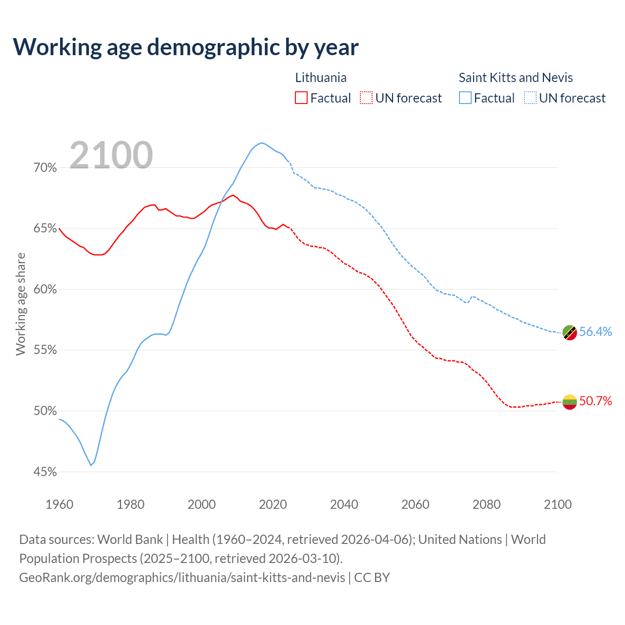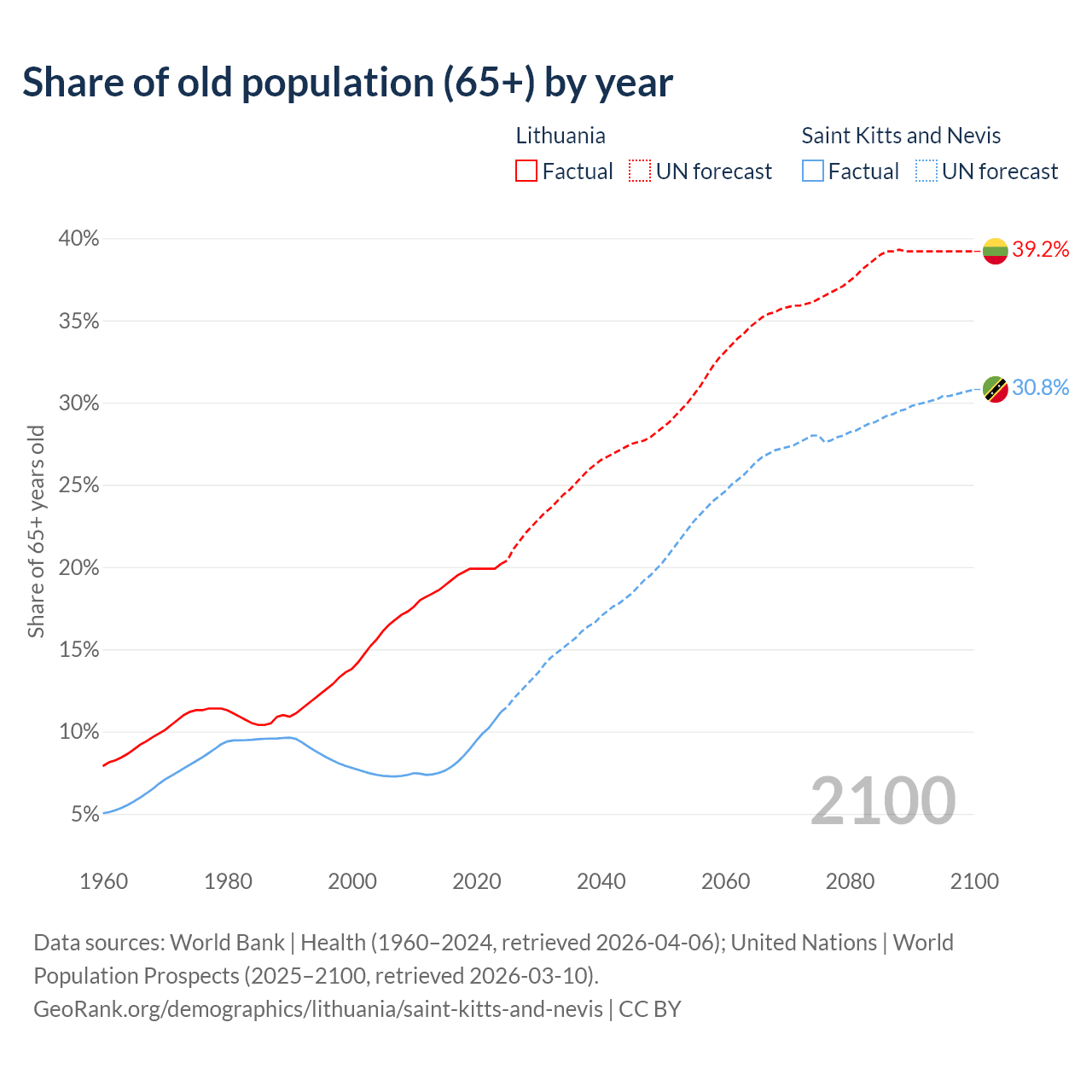 The share of older people aged 65 and over is 20.2% in Lithuania and 11.2% in Saint Kitts and Nevis. Life expectancy in Lithuania compared to Saint Kitts and Nevis .