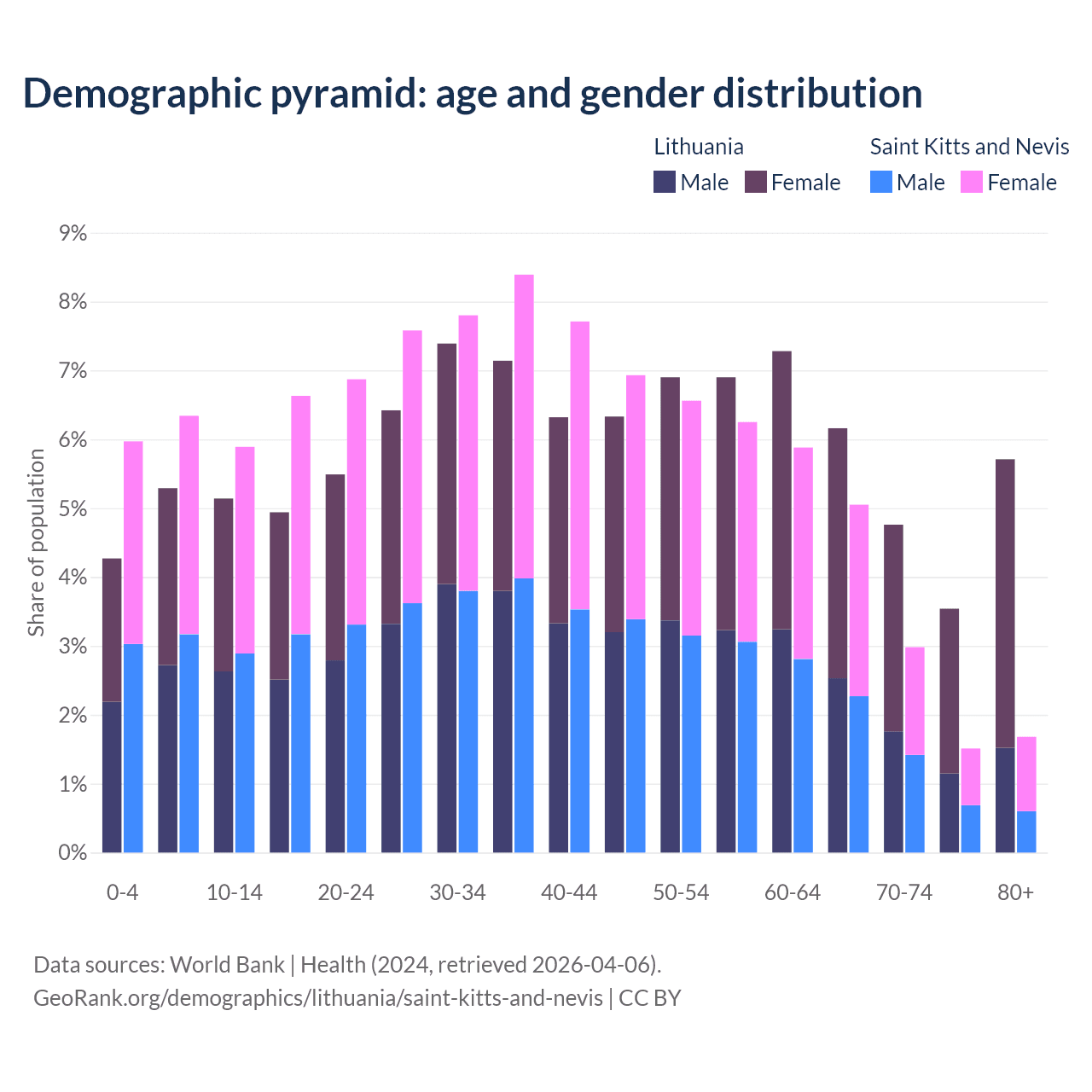 - The share of old-age demographic (65+) in Lithuania is 20.2% vs 11.2% in Saint Kitts and Nevis.