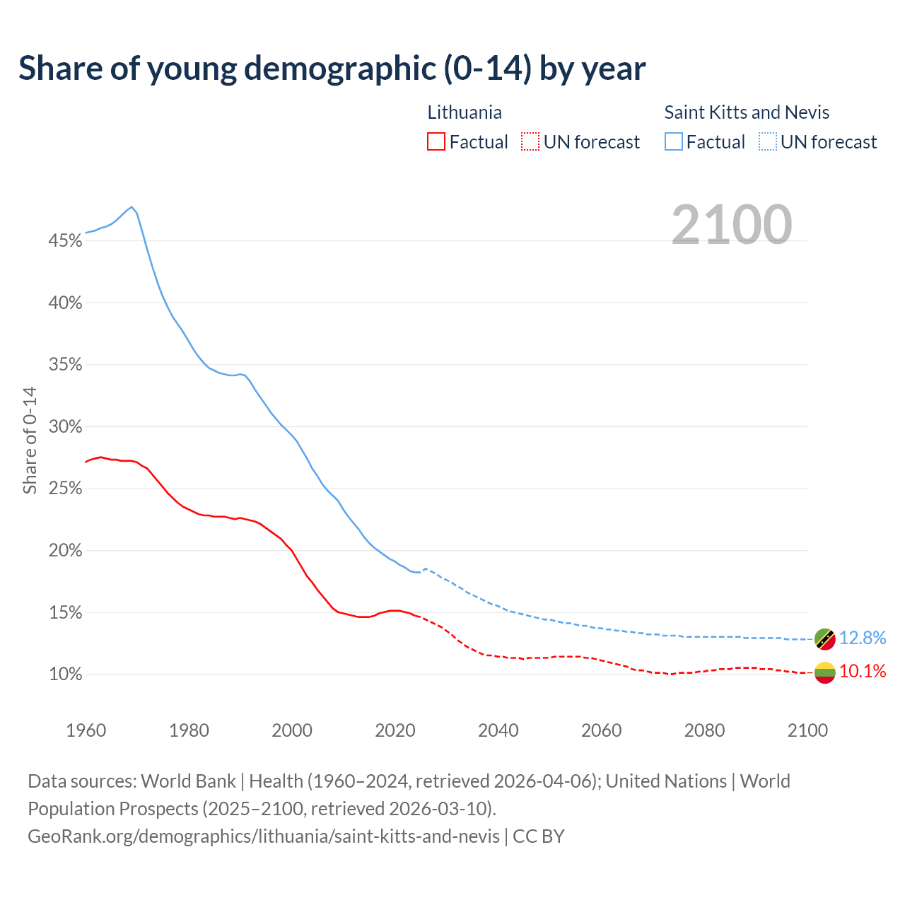 - The share of young demographic (0-15 years old) in Lithuania is 14.7% vs 18.2% in Saint Kitts and Nevis.