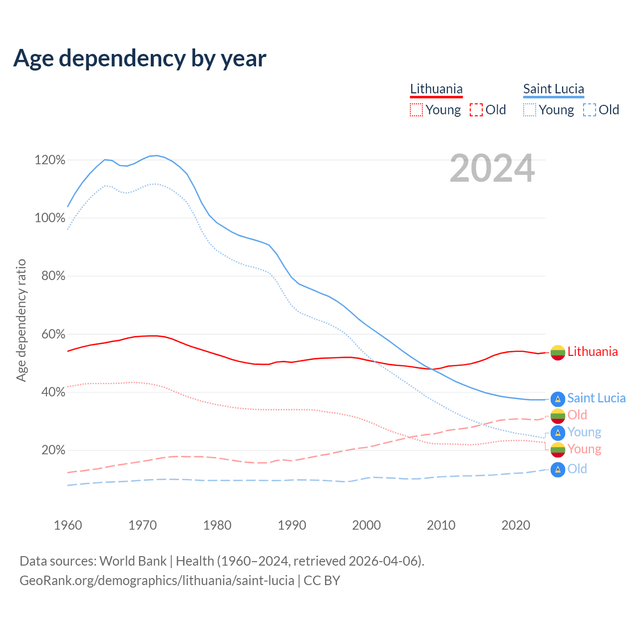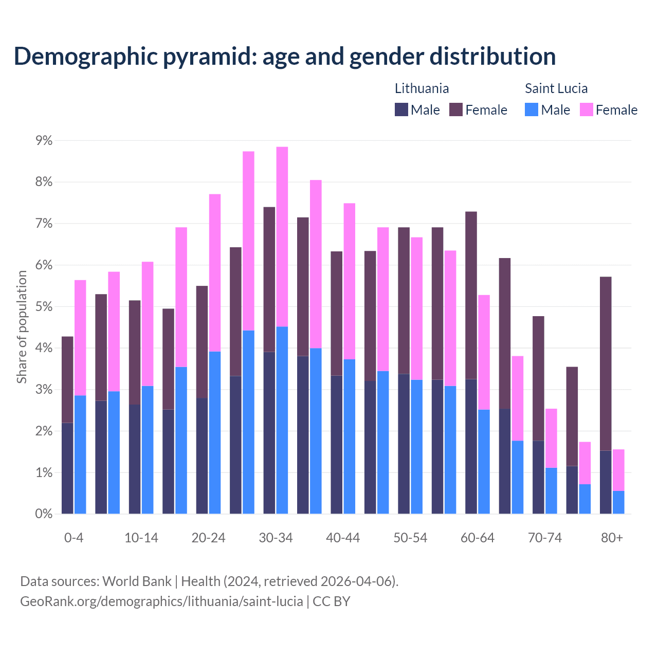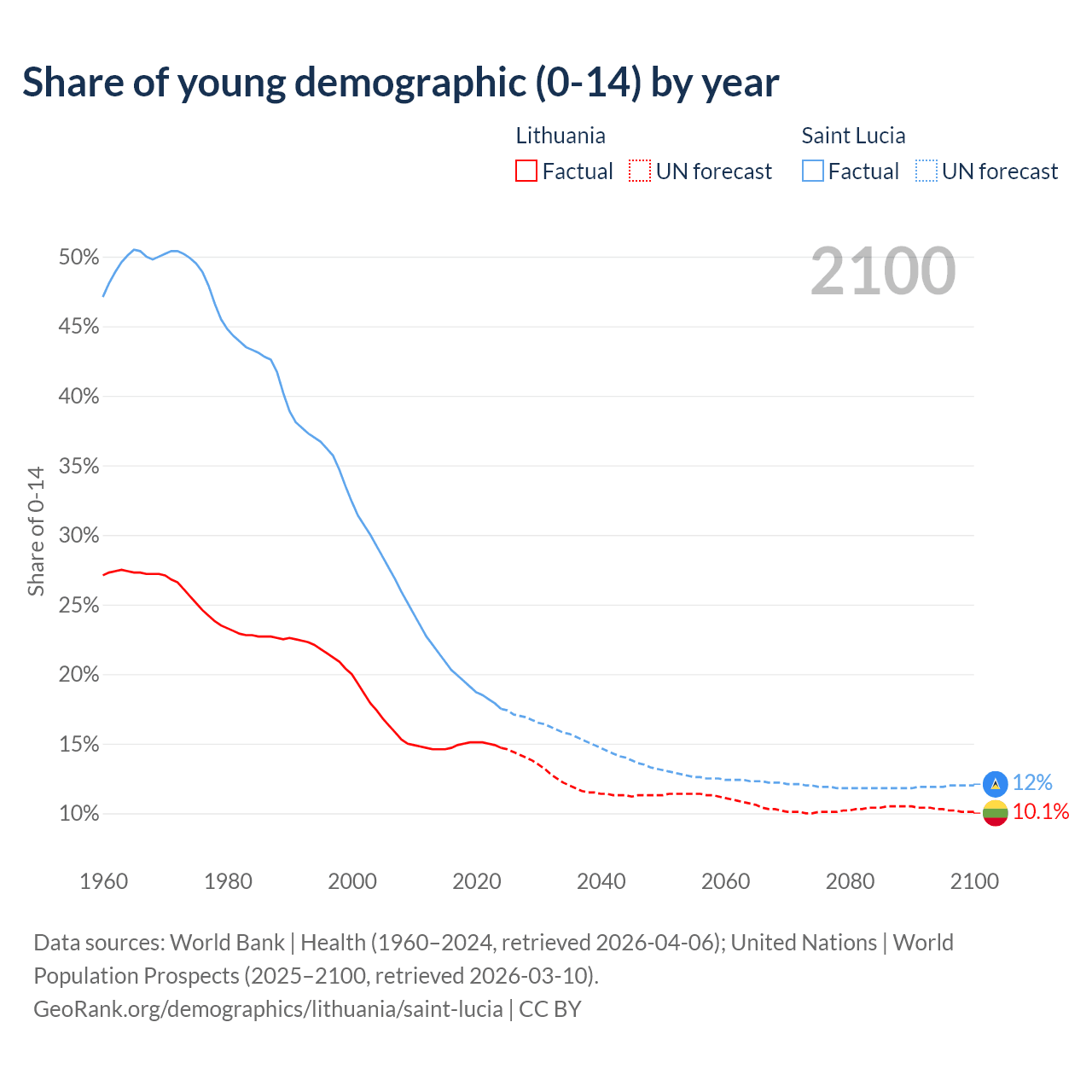 - The share of young demographic (0-15 years old) in Lithuania is 14.7% vs 17.5% in Saint Lucia.