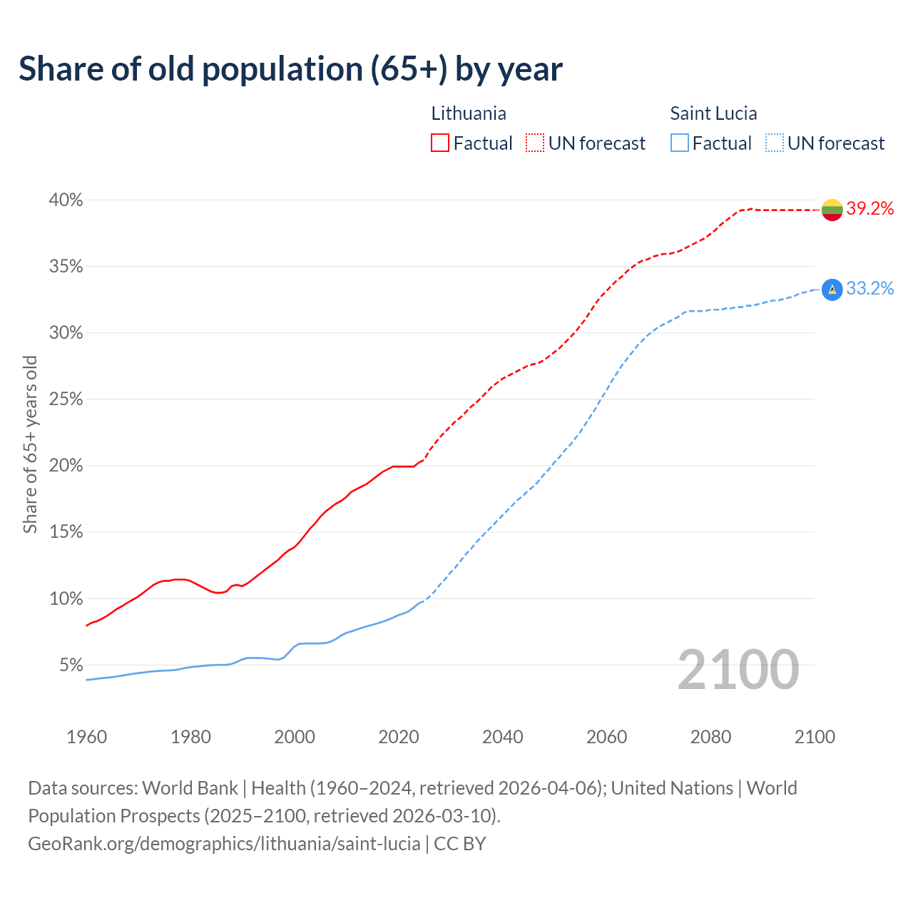 The share of older people aged 65 and over is 20.2% in Lithuania and 9.62% in Saint Lucia. Life expectancy in Lithuania compared to Saint Lucia .
