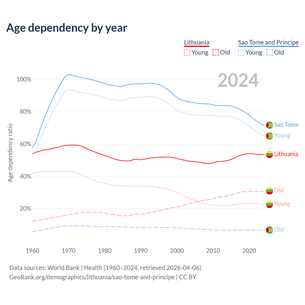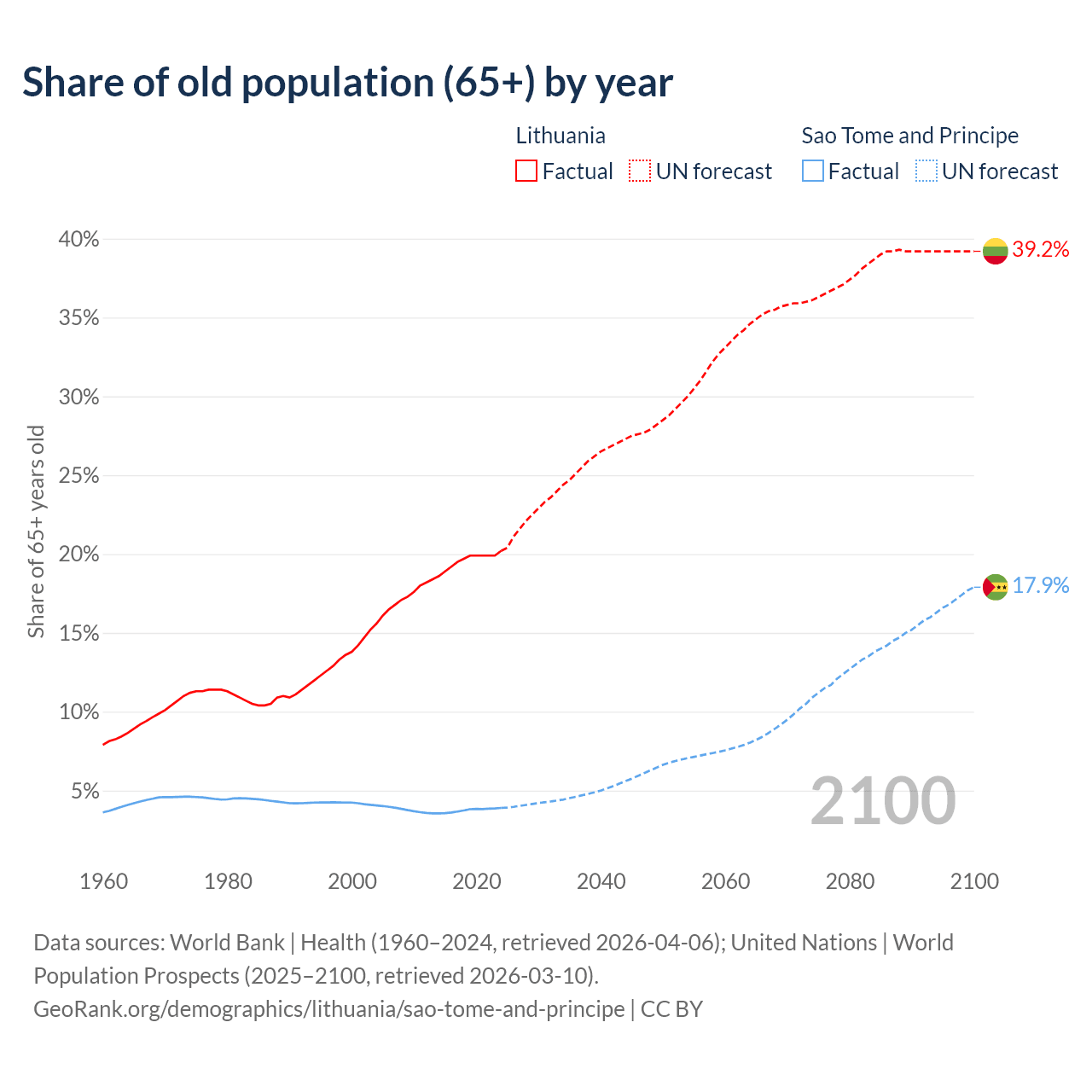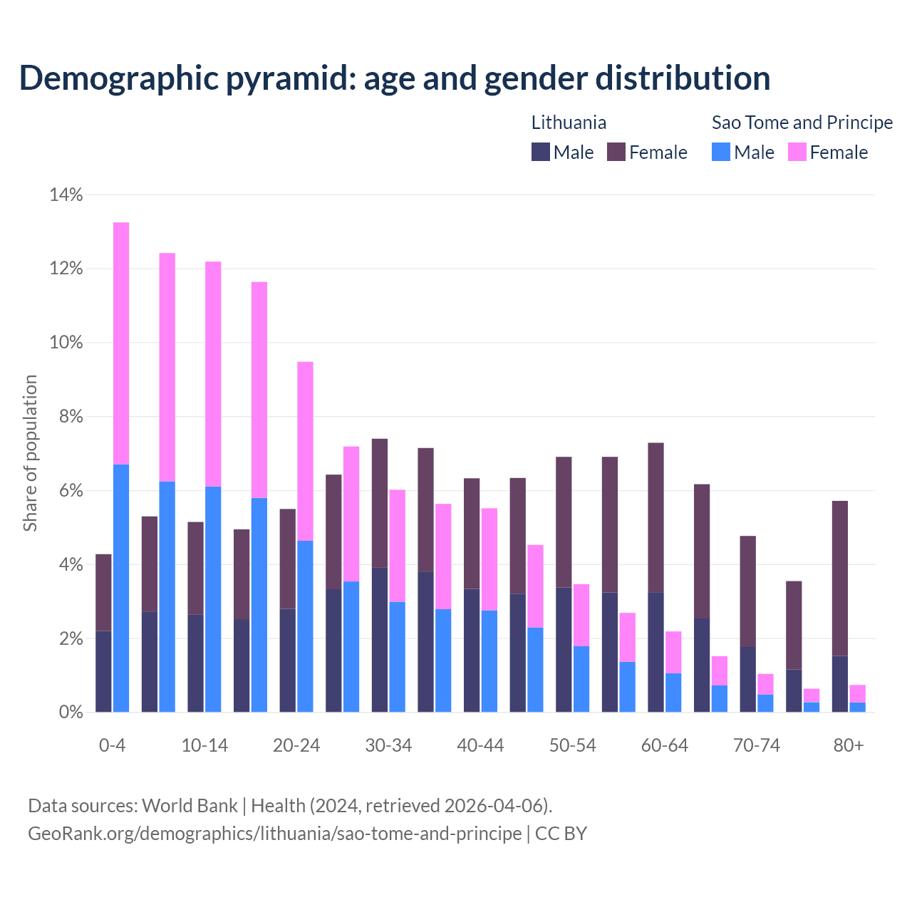 The share of older people aged 65 and over is 20.2% in Lithuania and 3.9% in Sao Tome and Principe. Life expectancy in Lithuania compared to Sao Tome and Principe .