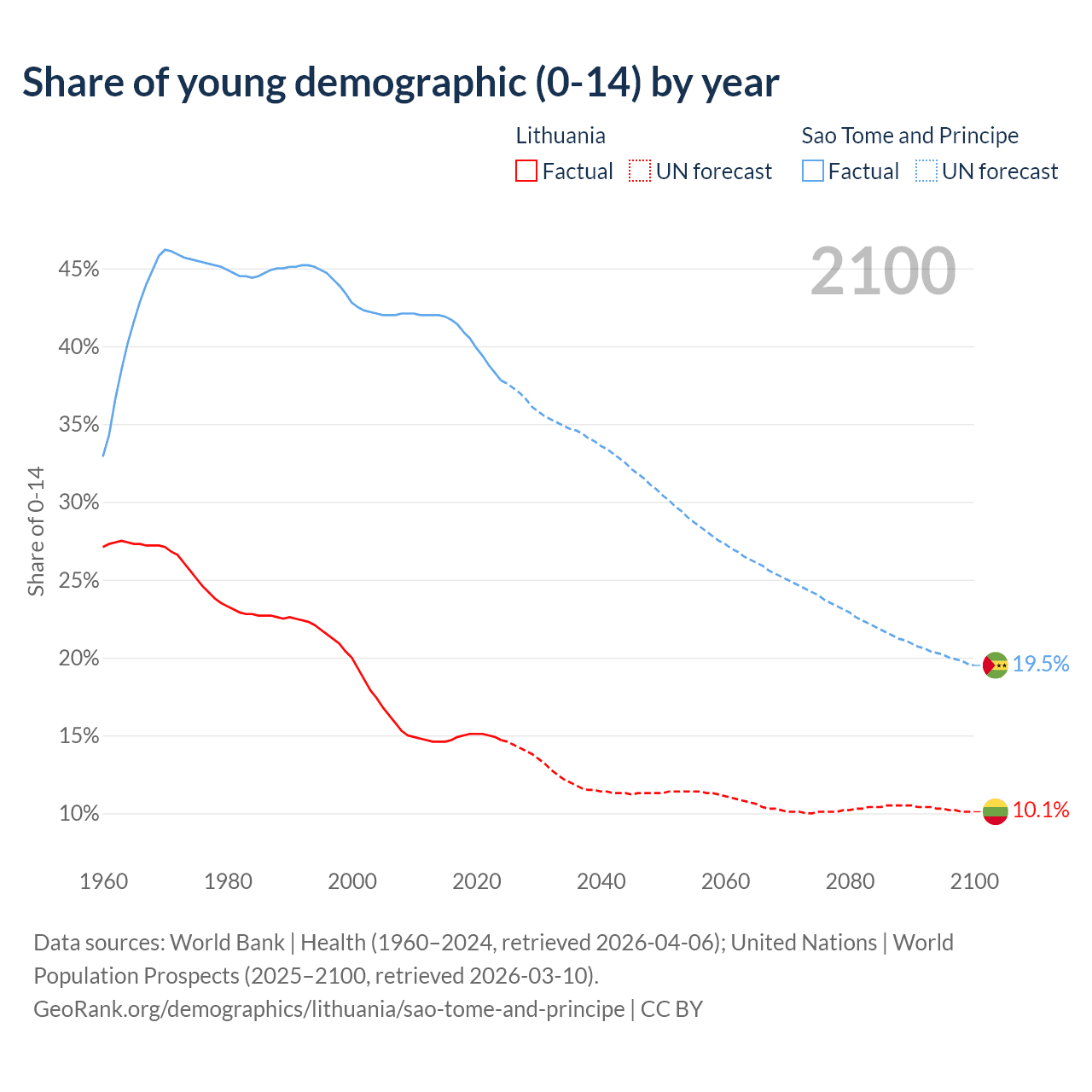 - The share of young demographic (0-15 years old) in Lithuania is 14.7% vs 37.8% in Sao Tome and Principe.