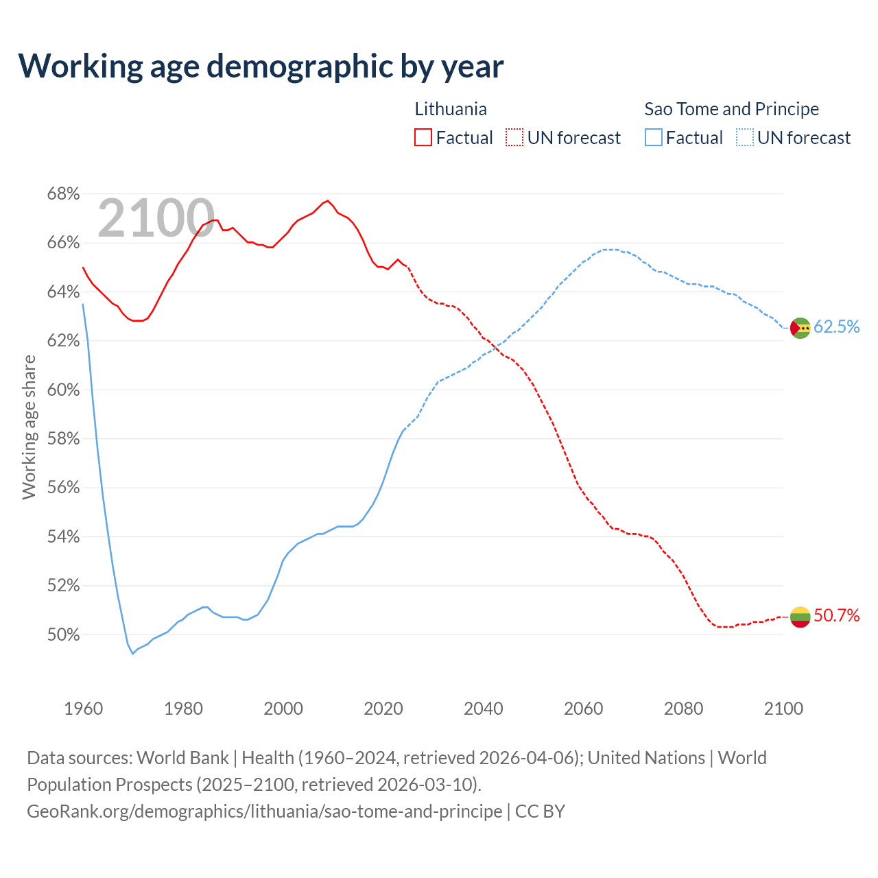 - Lithuania has 1.84M working age adults (aged 15-64) vs 144K in Sao Tome and Principe.