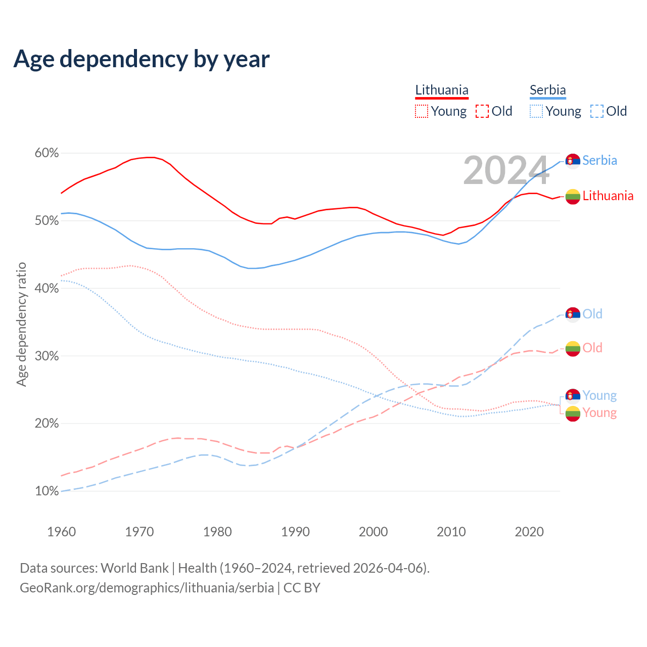 - Lithuania is ranked 28/196 by median age (oldest to youngest) vs 15/196 for Serbia.