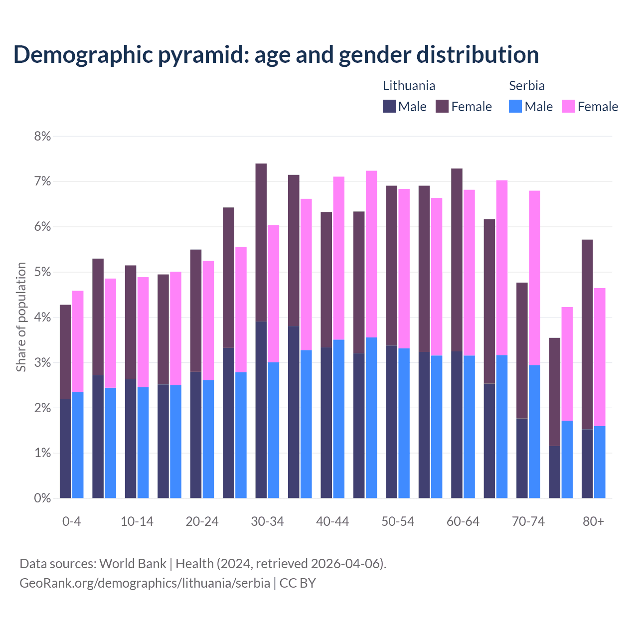 The share of older people aged 65 and over is 20.2% in Lithuania and 22.7% in Serbia. Life expectancy in Lithuania compared to Serbia .