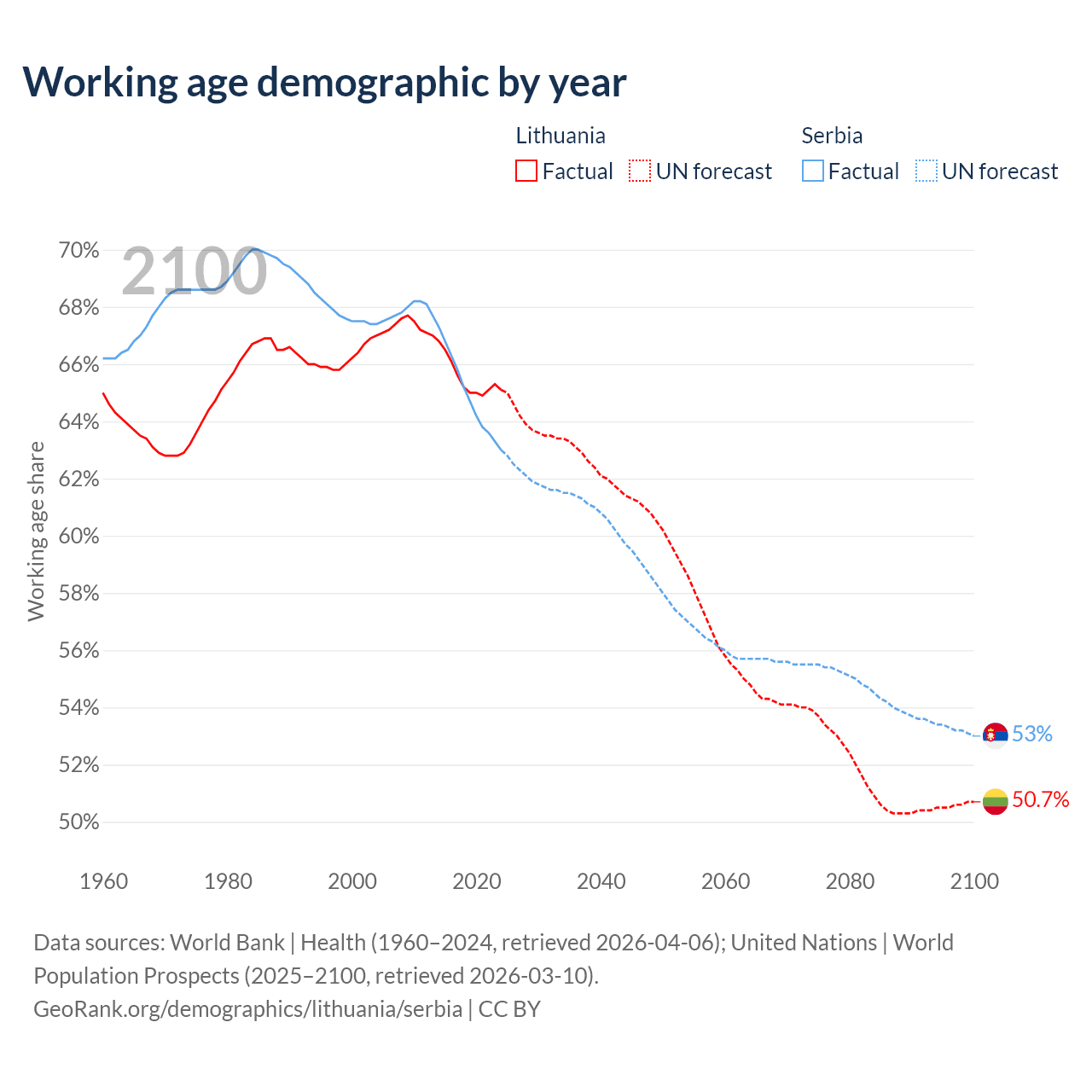 Median age Lithuania vs Serbia, 1960-2100