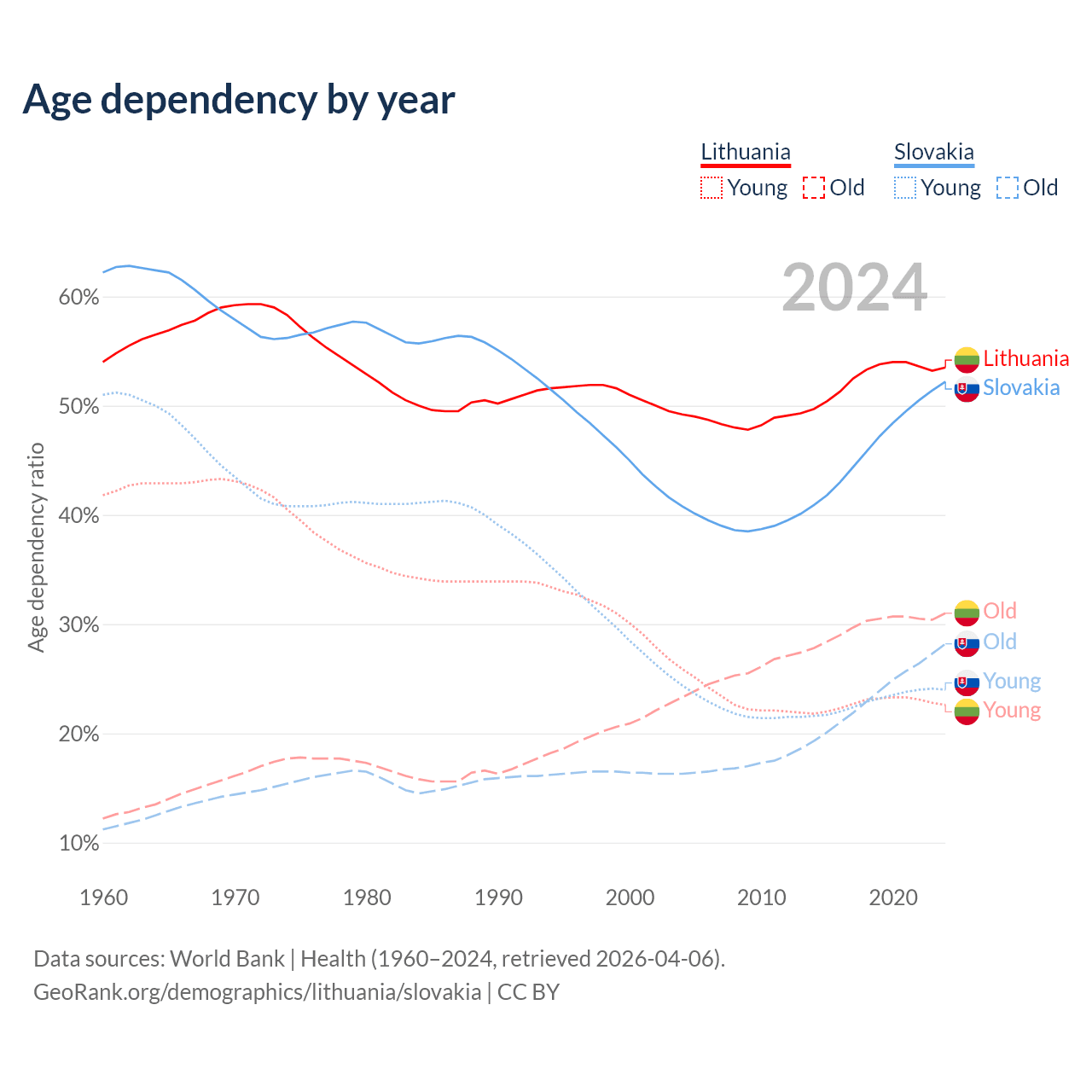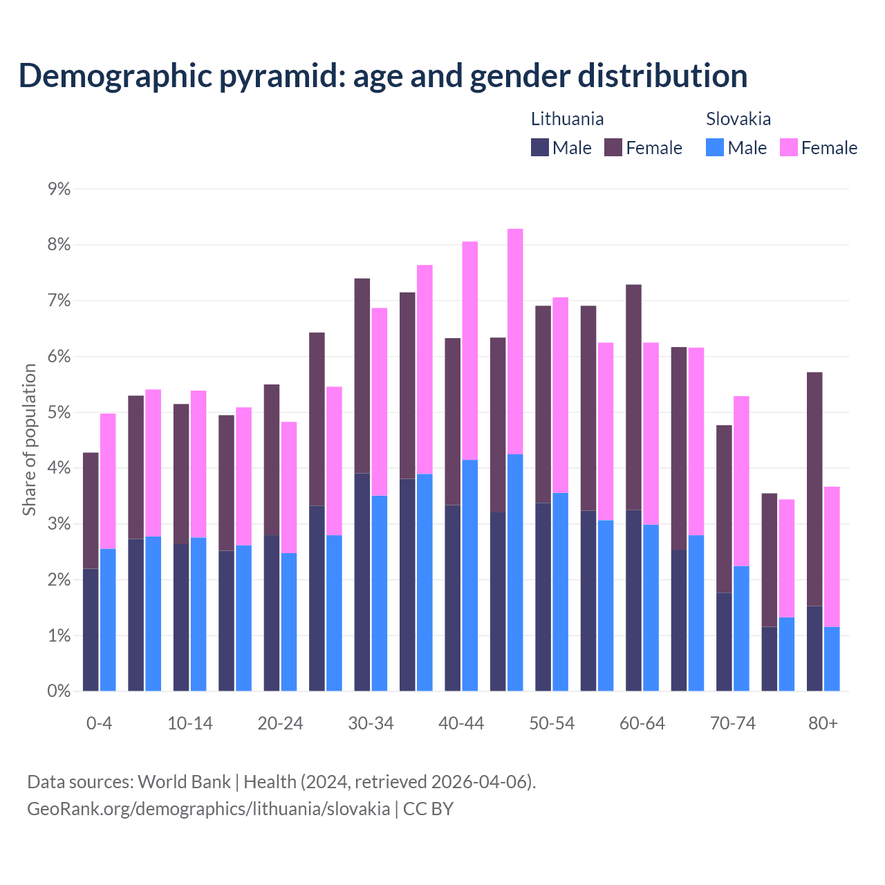 - Lithuania is ranked 28/196 by median age (oldest to youngest) vs 31/196 for Slovakia.