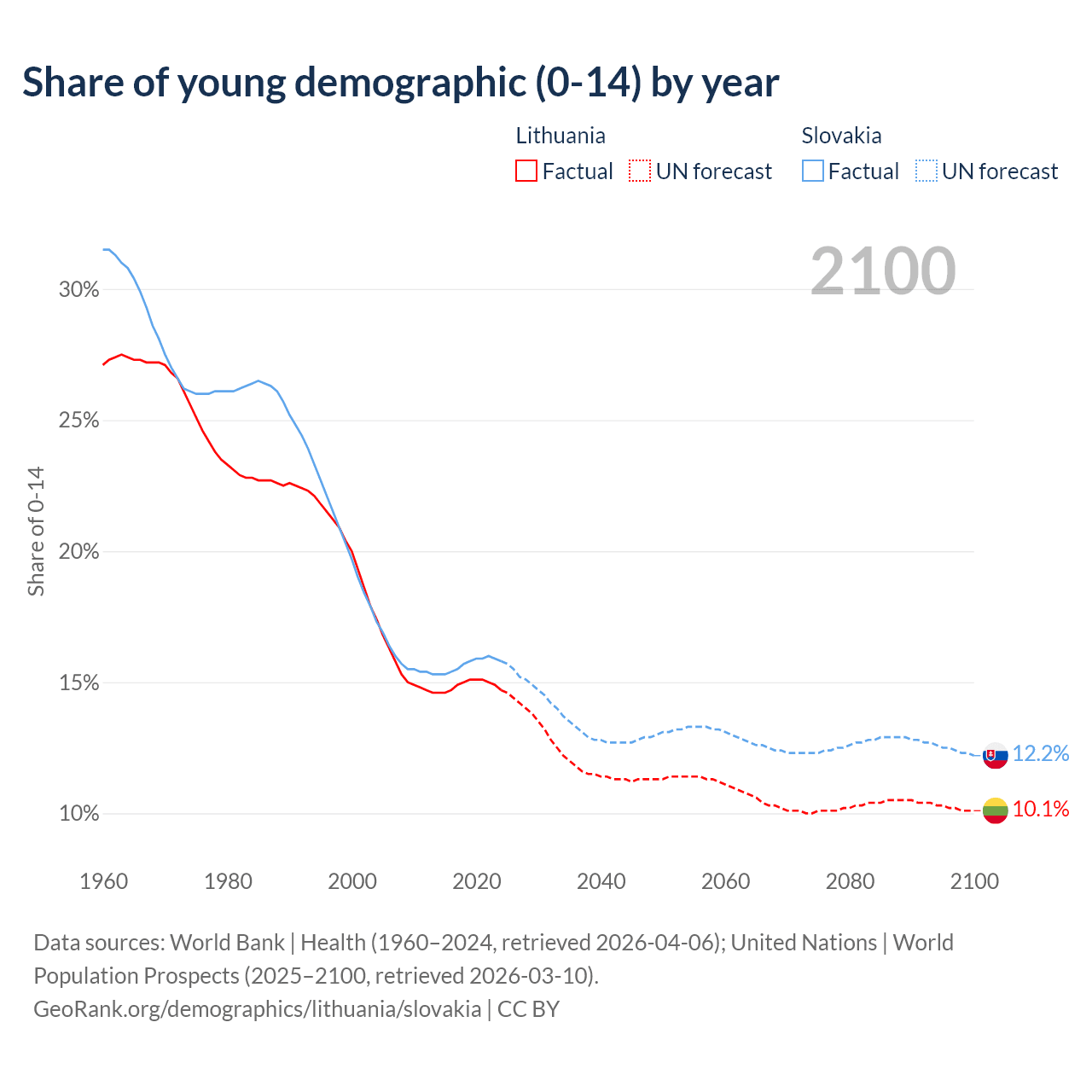 - The share of young demographic (0-15 years old) in Lithuania is 14.7% vs 15.8% in Slovakia.
