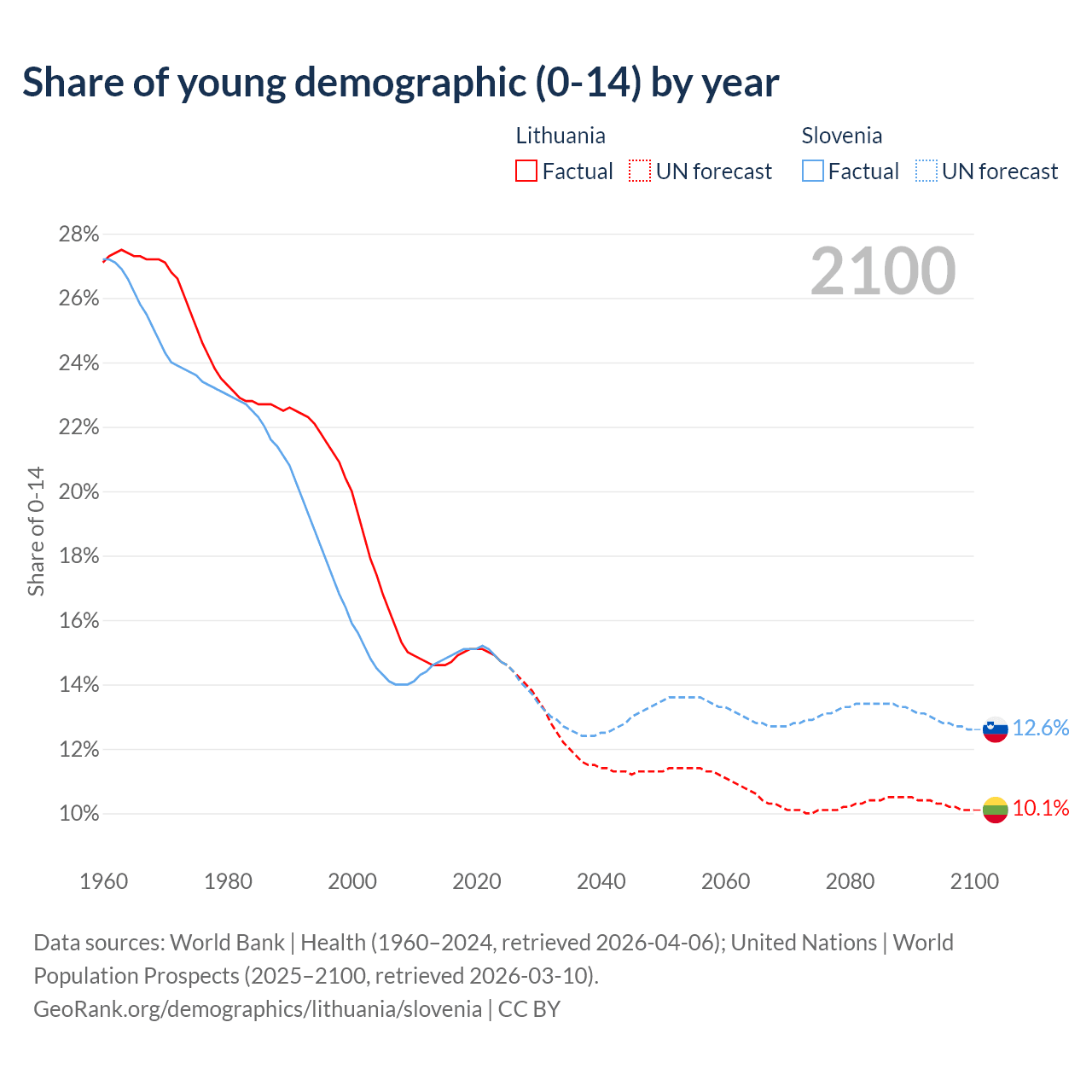 - The share of young demographic (0-15 years old) in Lithuania is 14.7% vs 14.7% in Slovenia.