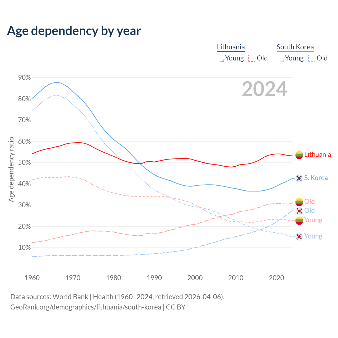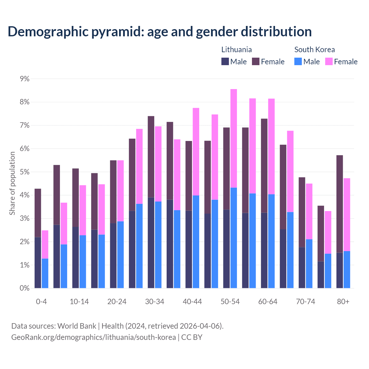 The share of older people aged 65 and over is 20.2% in Lithuania and 19.3% in South Korea. Life expectancy in Lithuania compared to South Korea .