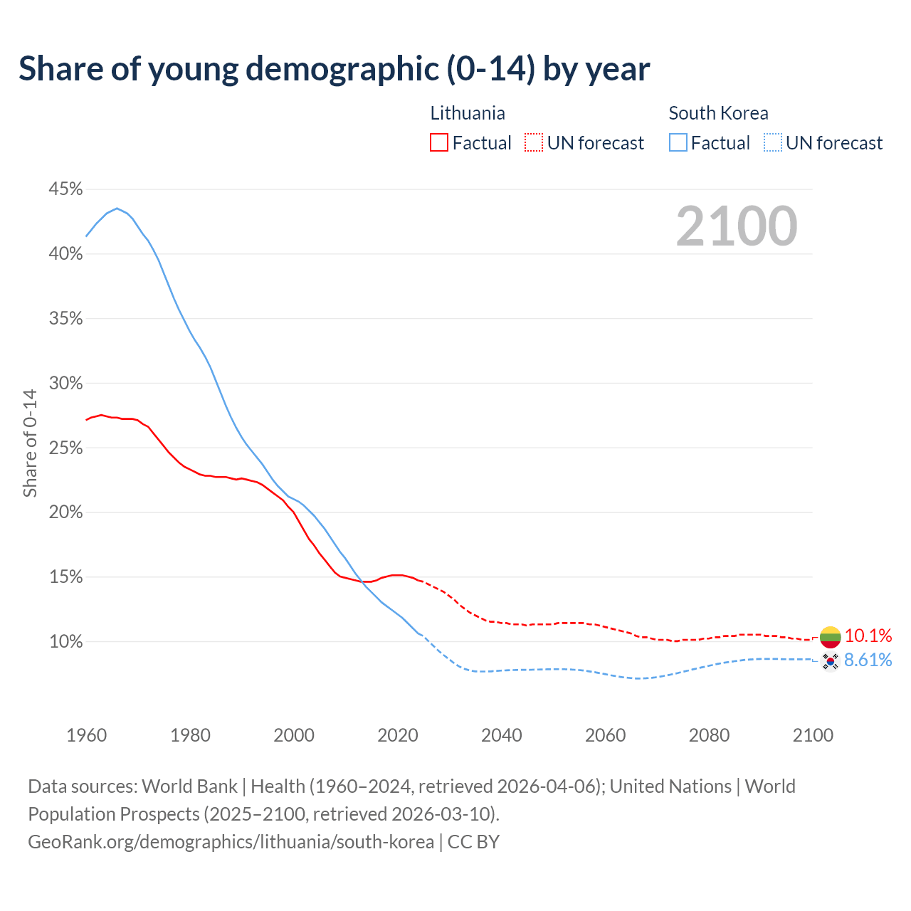 - The share of young demographic (0-15 years old) in Lithuania is 14.7% vs 10.6% in South Korea.