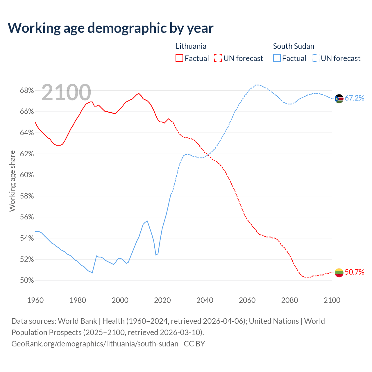 Median age Lithuania vs South Sudan, 1960-2100