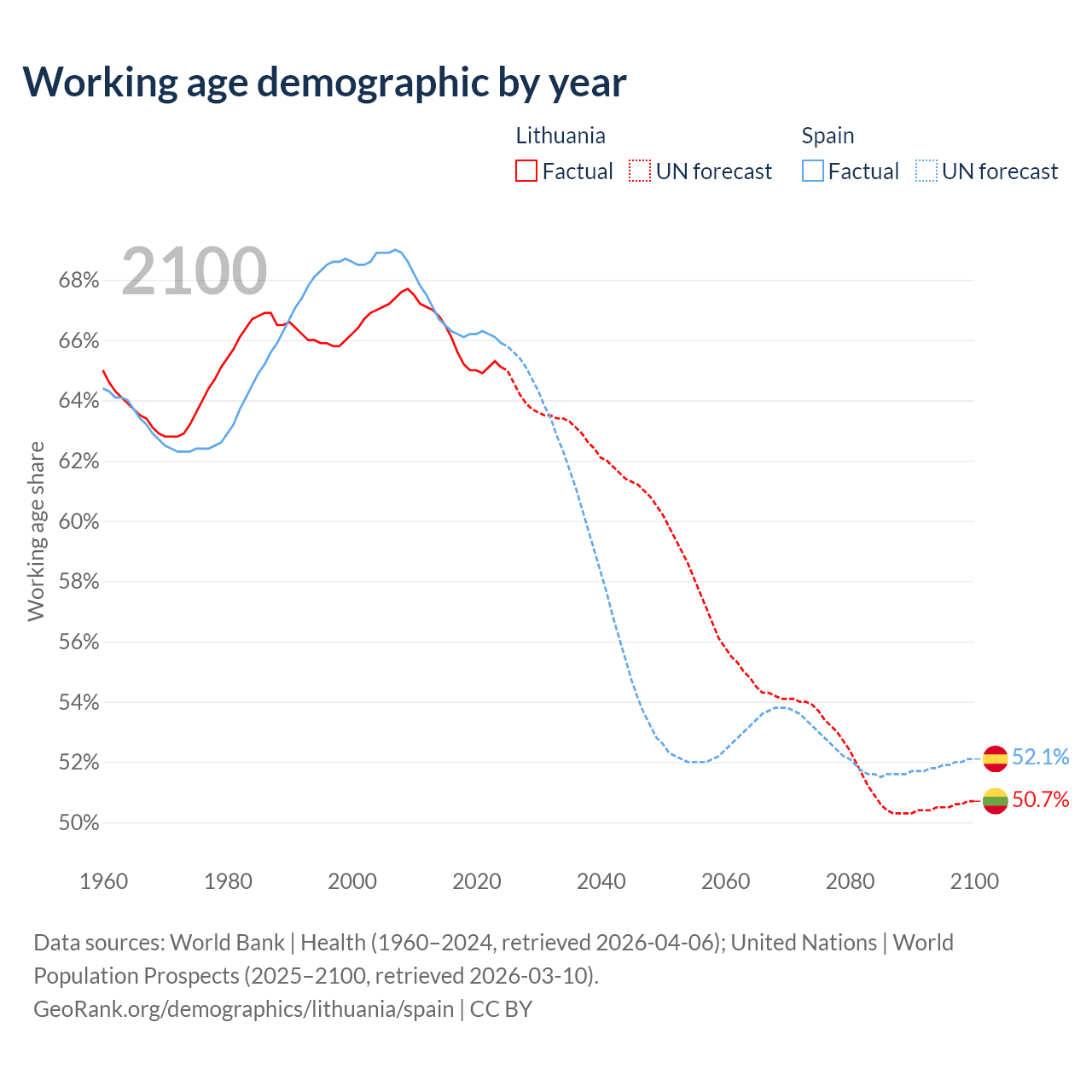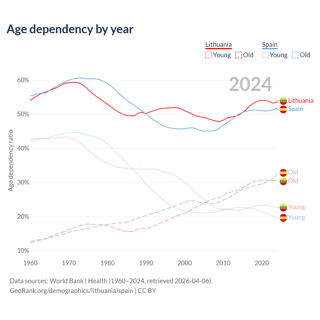 The share of older people aged 65 and over is 20.2% in Lithuania and 21.1% in Spain. Life expectancy in Lithuania compared to Spain .