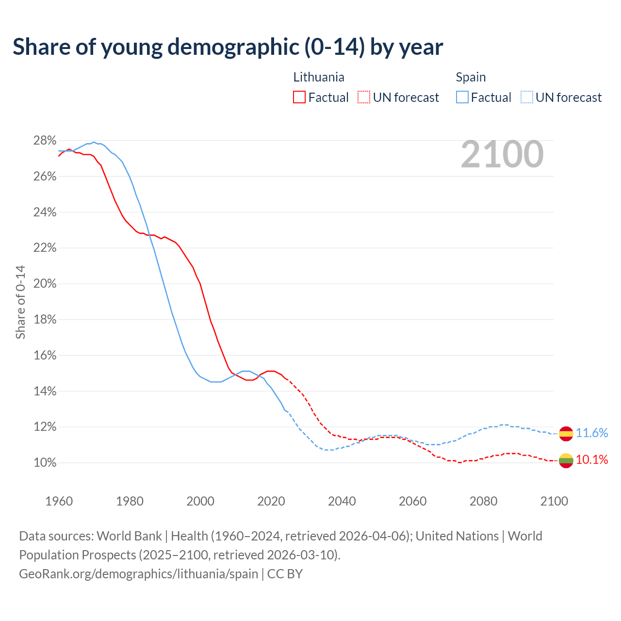 - The share of young demographic (0-15 years old) in Lithuania is 14.7% vs 12.9% in Spain.
