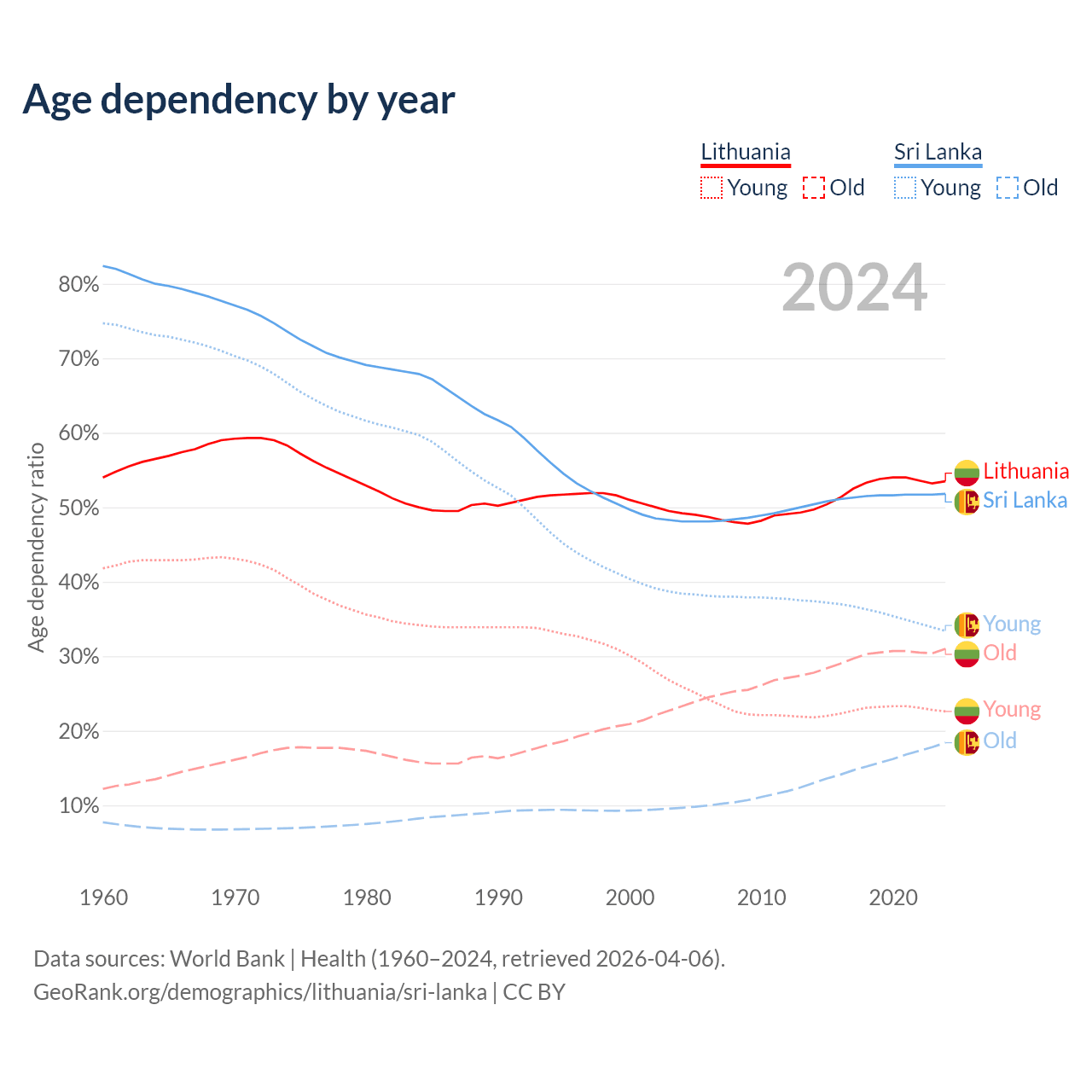 The share of older people aged 65 and over is 20.2% in Lithuania and 12.1% in Sri Lanka. Life expectancy in Lithuania compared to Sri Lanka .