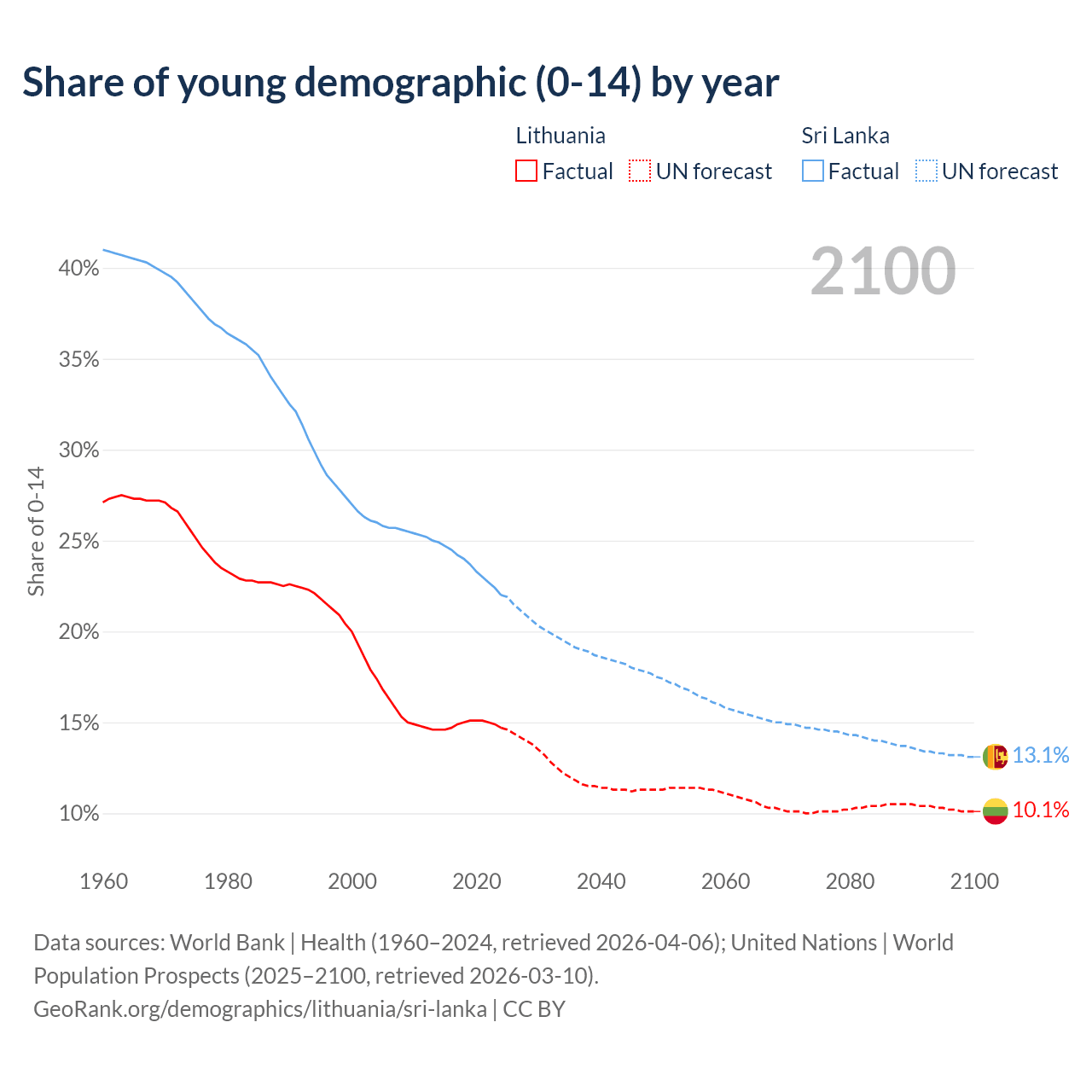 - The share of young demographic (0-15 years old) in Lithuania is 14.7% vs 22% in Sri Lanka.