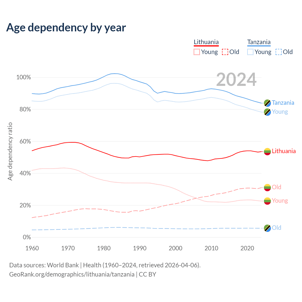 - Lithuania is ranked 28/196 by median age (oldest to youngest) vs 184/196 for Tanzania.