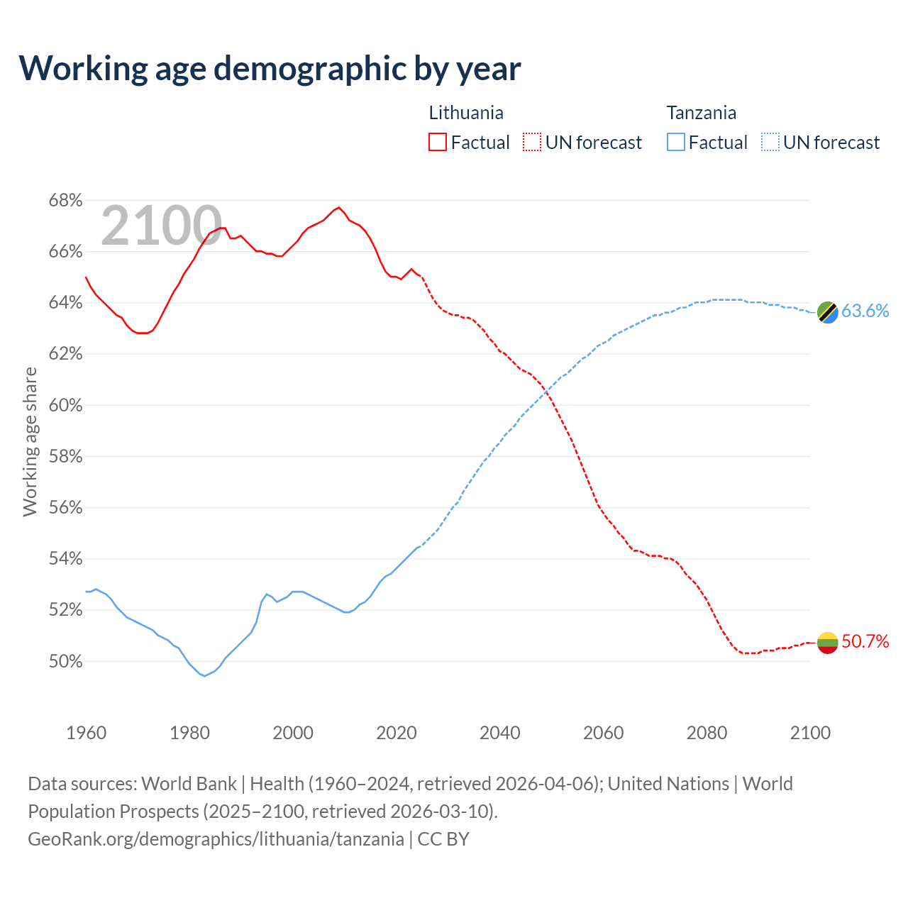 - Lithuania has 1.84M working age adults (aged 15-64) vs 39.8M in Tanzania.