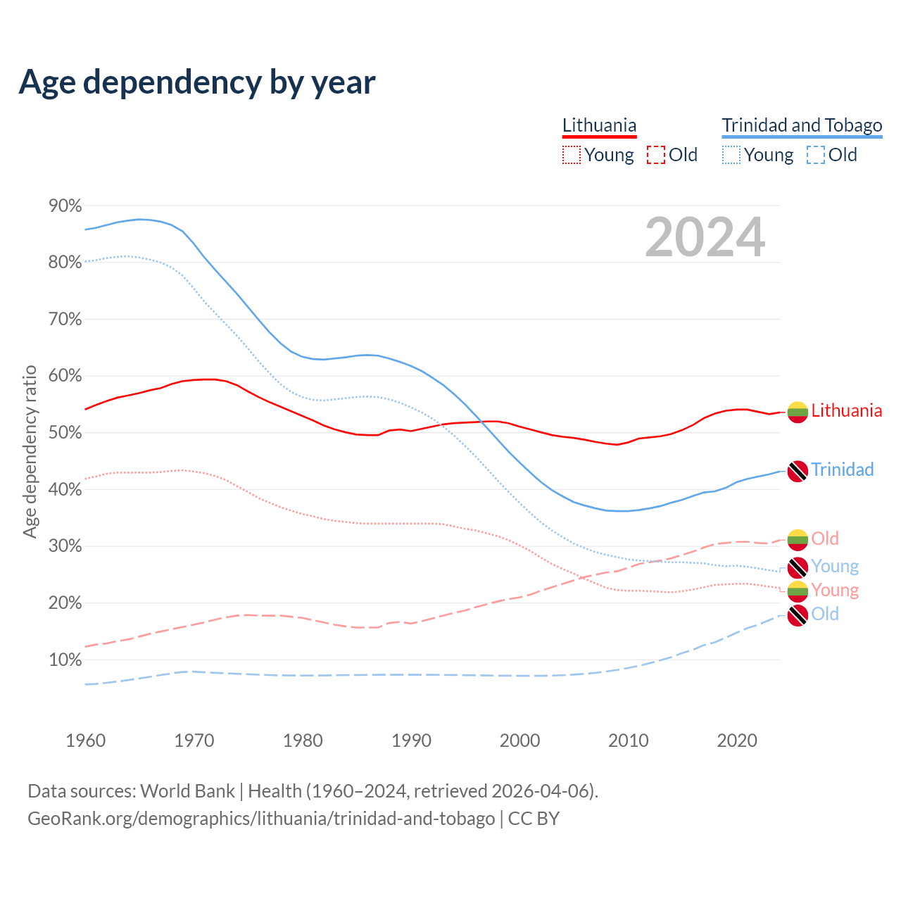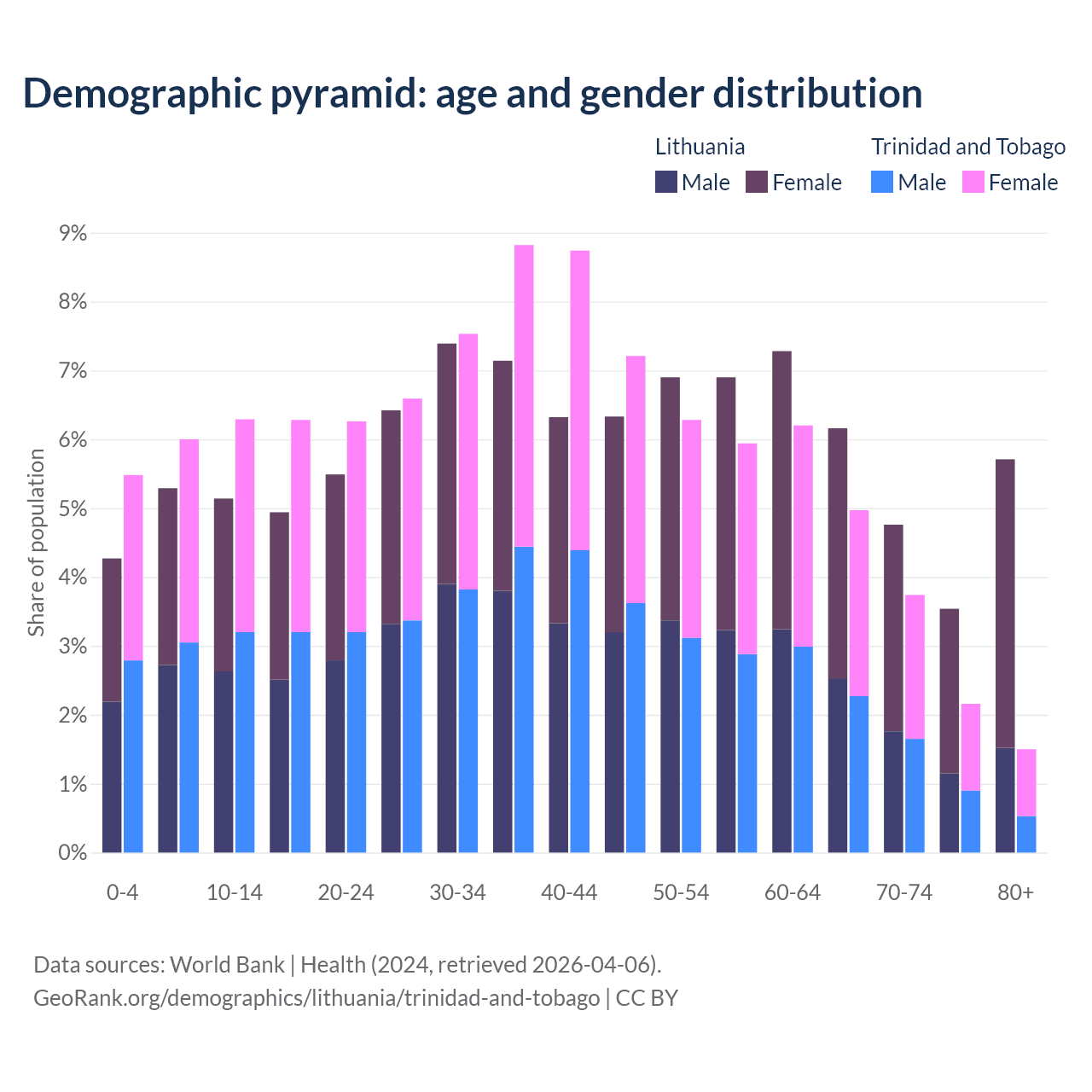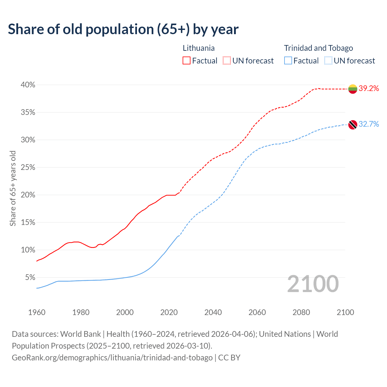The share of older people aged 65 and over is 20.2% in Lithuania and 12.4% in Trinidad and Tobago. Life expectancy in Lithuania compared to Trinidad and Tobago .