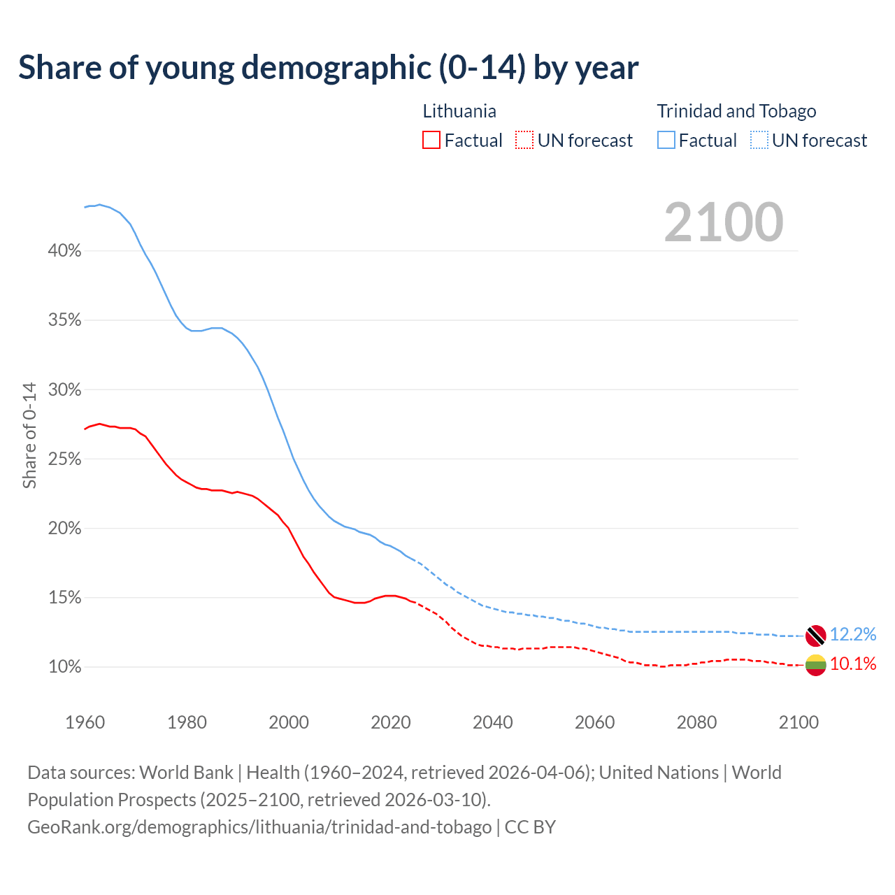 - The share of young demographic (0-15 years old) in Lithuania is 14.7% vs 17.8% in Trinidad and Tobago.