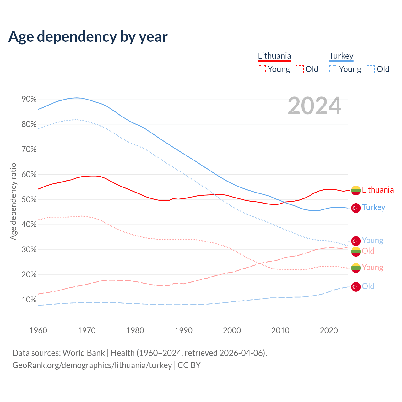 The share of older people aged 65 and over is 20.2% in Lithuania and 10.3% in Turkey. Life expectancy in Lithuania compared to Turkey .