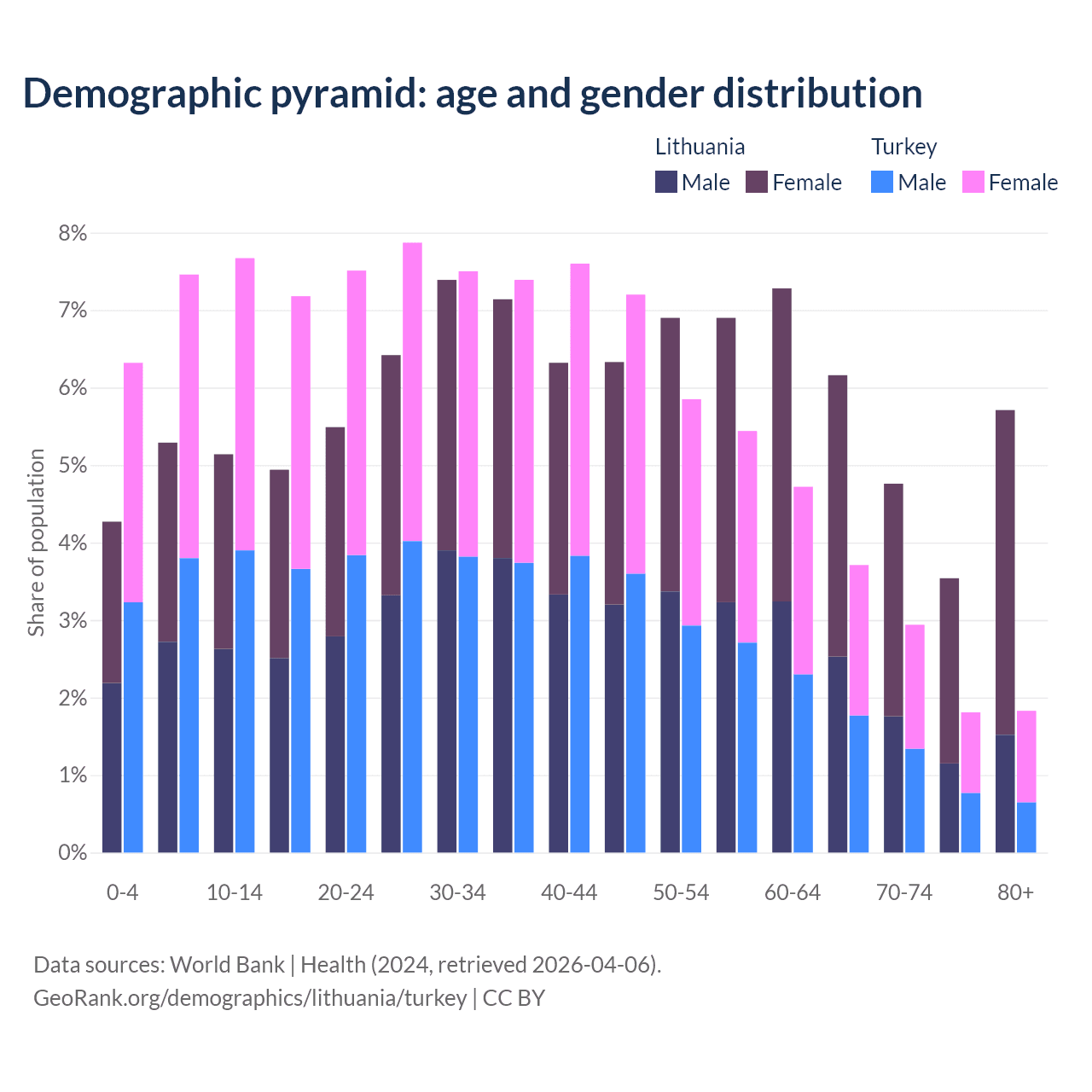 - Lithuania is ranked 28/196 by median age (oldest to youngest) vs 83/196 for Turkey.