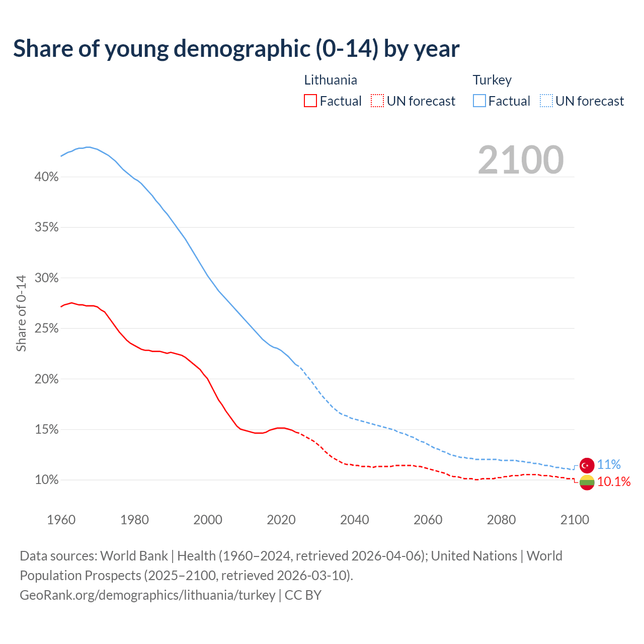 - The share of young demographic (0-15 years old) in Lithuania is 14.7% vs 21.4% in Turkey.