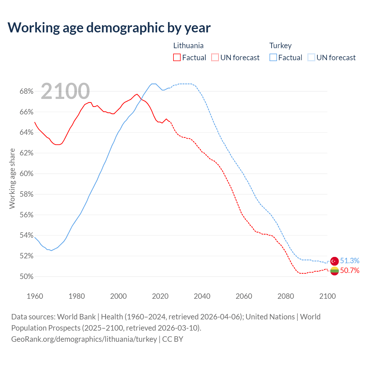 - Lithuania has 1.84M working age adults (aged 15-64) vs 58.7M in Turkey.