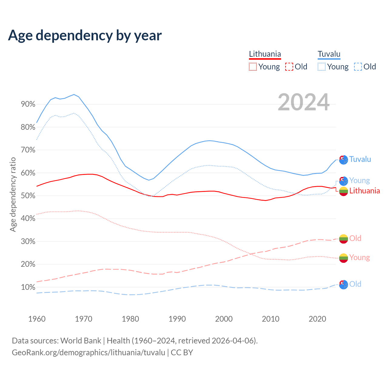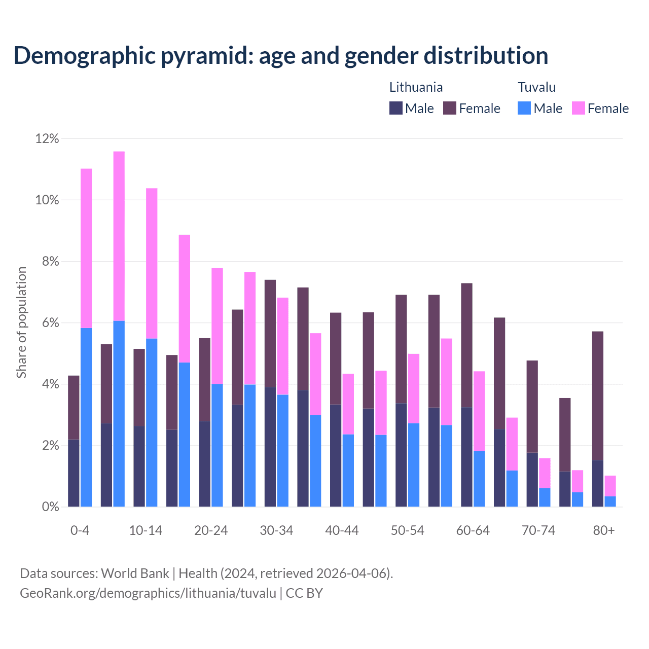 - The share of old-age demographic (65+) in Lithuania is 20.2% vs 6.67% in Tuvalu.